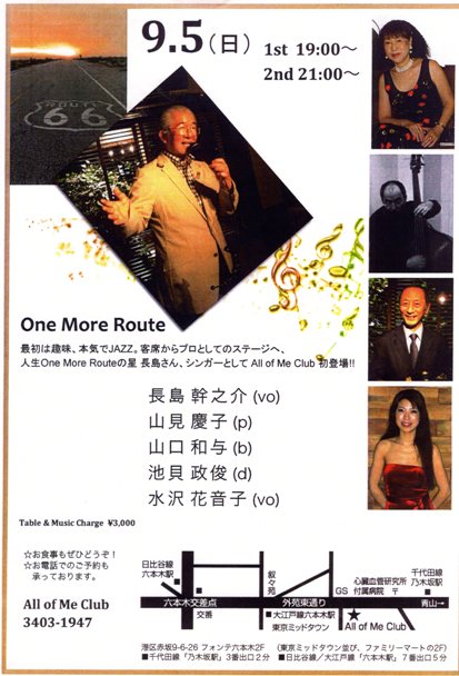 67年に入社後、名古屋を始めとして、東京、松山、大阪に勤務し、歌特にジャズには一方ならぬ興味を持ち、マイクを手にすると、演歌など見向きもせず、英語の歌詞の歌を披露し、我々を唖然とさせたもので、特に休日には六本木のライブハウスまで出向いて歌っていた程でした。そんな趣味が高じて、遂に定年後ジャズ界の大御所で、歌手でもあるマーサ三宅(大橋巨泉の前妻)一門に師事、精進し、努力の結果遂にその実力が認められアラ70のプロデビューとなった次第です。デビュー後はライブに多忙のようで、地方にも出向くこともあるそうです。そのライブの一つがご案内の9月5日(1回目19時から、2回目21時から)に開催されます。ジャズに興味のある方、お近くの方は是非にお運び下さるようお願い致します。