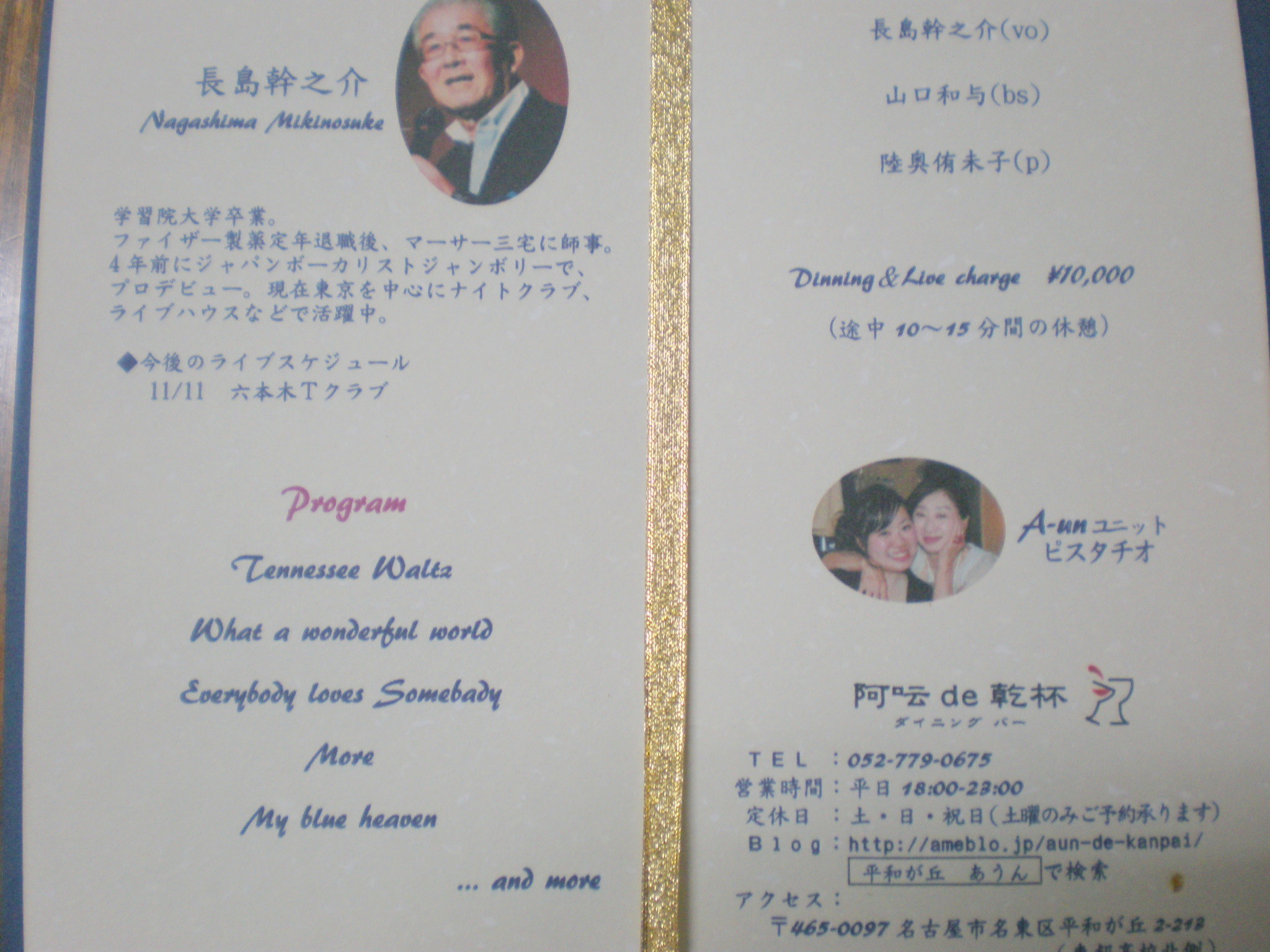 先に、定年後ジャズシンガーとしてプロデビューしたと皆様に紹介しました長島幹之介(本名長島正彦)さんが、いよいよ名古屋に下記の企画で初お目見えします。この一年間東京を拠点に、各地でその歌声を披露し、研鑽を重ねて実力を蓄えてきたと伝え聞いております。そして、この企画が誕生しました。
