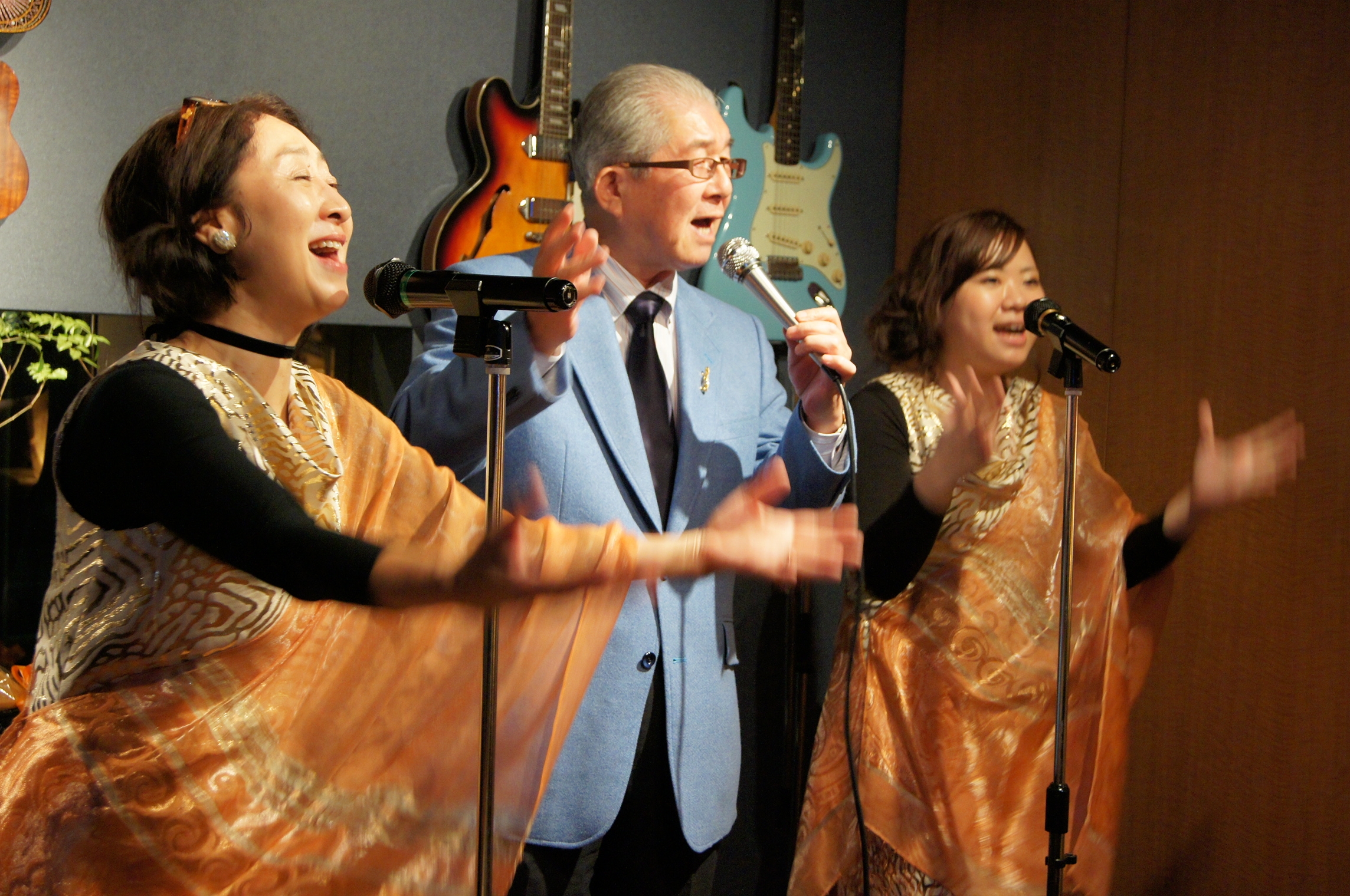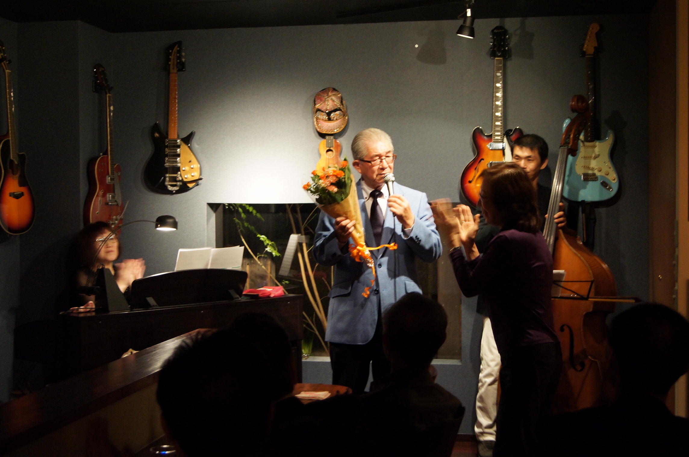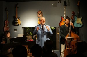 20人程収容可能なこじんまりとした会場で、ベースとピアノの生演奏の中10数曲を歌い上げました。その曲は我々が若かりし頃巷によく聞かれた曲ばかりで、思わず一緒にくちずさんだり、掛け声をかけたりとシンガーと一体になってしまいました。幹之介さんもすっかり乗って、途中一寸喉を嗄らす場面(続けて歌いすぎて)も見られましたが、休憩を挟みながらも2時間を立派に歌い上げました。感心感嘆したのは、全ての曲を英語の歌詞であった事でした。年齢的にも中々記憶できるものではと考えましたのですが、本人曰く、英語は得意なのだそうです。そのへんはやはり外資系のファイザーの出身なのだと、また合間のトークもMRで鍛えたのか上手でした。