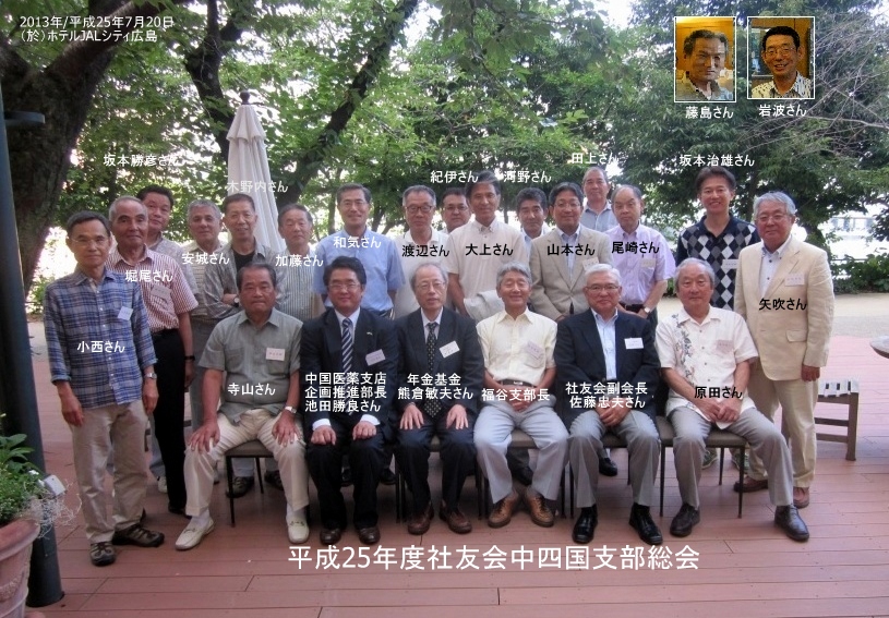 7月20日(土)支部総会がホテルJAL city 広島にて開催されました。本部(佐藤副会長)年金基金(熊倉常務理事)支店(池田企画推進部長)出席のもと(支店業務推進部の石黒さんにお手伝いをいただき)会員21名の合計25名での総会となりました。支部状況の報告・会計報告・会則変更・役員改選・新入会員紹介等の他、来賓の方それぞれの立場での明るいお話も賜りました。総会に引き続き、特に今回は遠くは京都・島根・山口・香川等からも多くの会員が出席され懇親会も大いに盛り上がり旧交を温めることが出来ました。来年の再開を約し元気よく渡辺さんの一本締めで散会となりました。(福谷 記)
