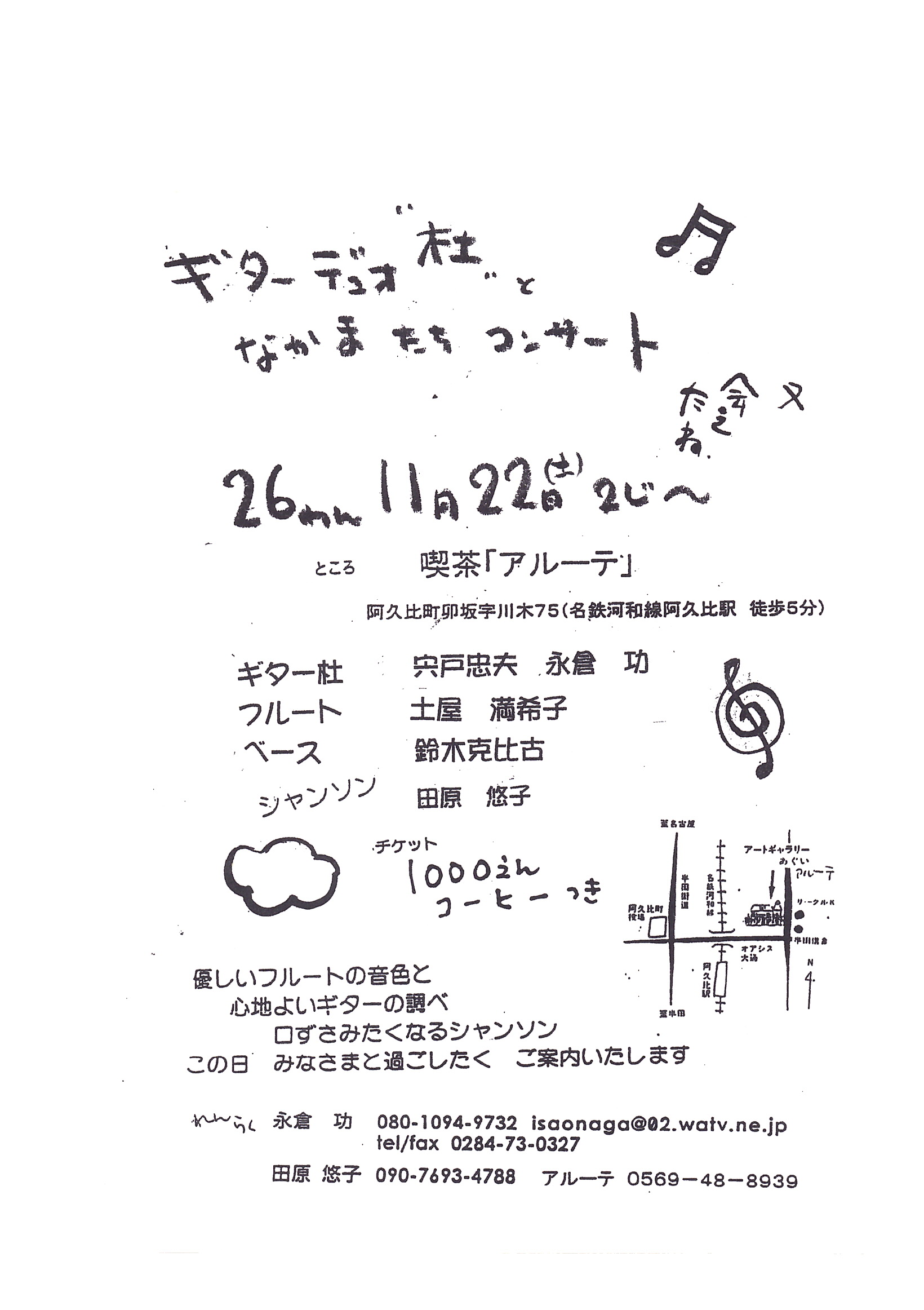 お知らせ・・・永倉功さんのコンサート!! 2014 10/03 武豊支部 2014年10月3日 武豊支部のみなさんへ、 おなじみの永倉功さんのコンサートです。 11月22日(土)阿久比の喫茶「アルーテ」会場と、翌日23日(日)名鉄犬山線の柏森「専修院」会場のふたつのご案内です。お誘い合わせの上、お出かけ下さい。 武豊支部 元浦 志信さんのホームページをリンクしました 平成26年度(第10回)武豊支部総会が開かれました(第1報) 関連記事 2025年度 社友会 武豊支部 役員のご案内 2025年10月28日 2025年 ファイザー社友会武豊支部総会・懇親会 スナップショット 2025年10月25日 2025年 ファイザー社友会武豊支部総会・懇親会 開催報告 2025年10月15日 武豊支部会員からのご案内(安藤正和氏からの連絡) 2025年5月12日 2025年度 支部総会の開催予定 2025年4月13日 武豊支部支部総会・懇親会 スナップ写真 2024年10月16日 2024年 社友会武豊支部支部総会・懇親会 開催報告 2024年10月16日 ファイザー社友会武豊支部総会 開催のご案内 2024年8月15日 コメント コメントする コメントをキャンセルコメント ※ 名前 ※ メール ※ サイト 次回のコメントで使用するためブラウザーに自分の名前、メールアドレス、サイトを保存する。 Δ