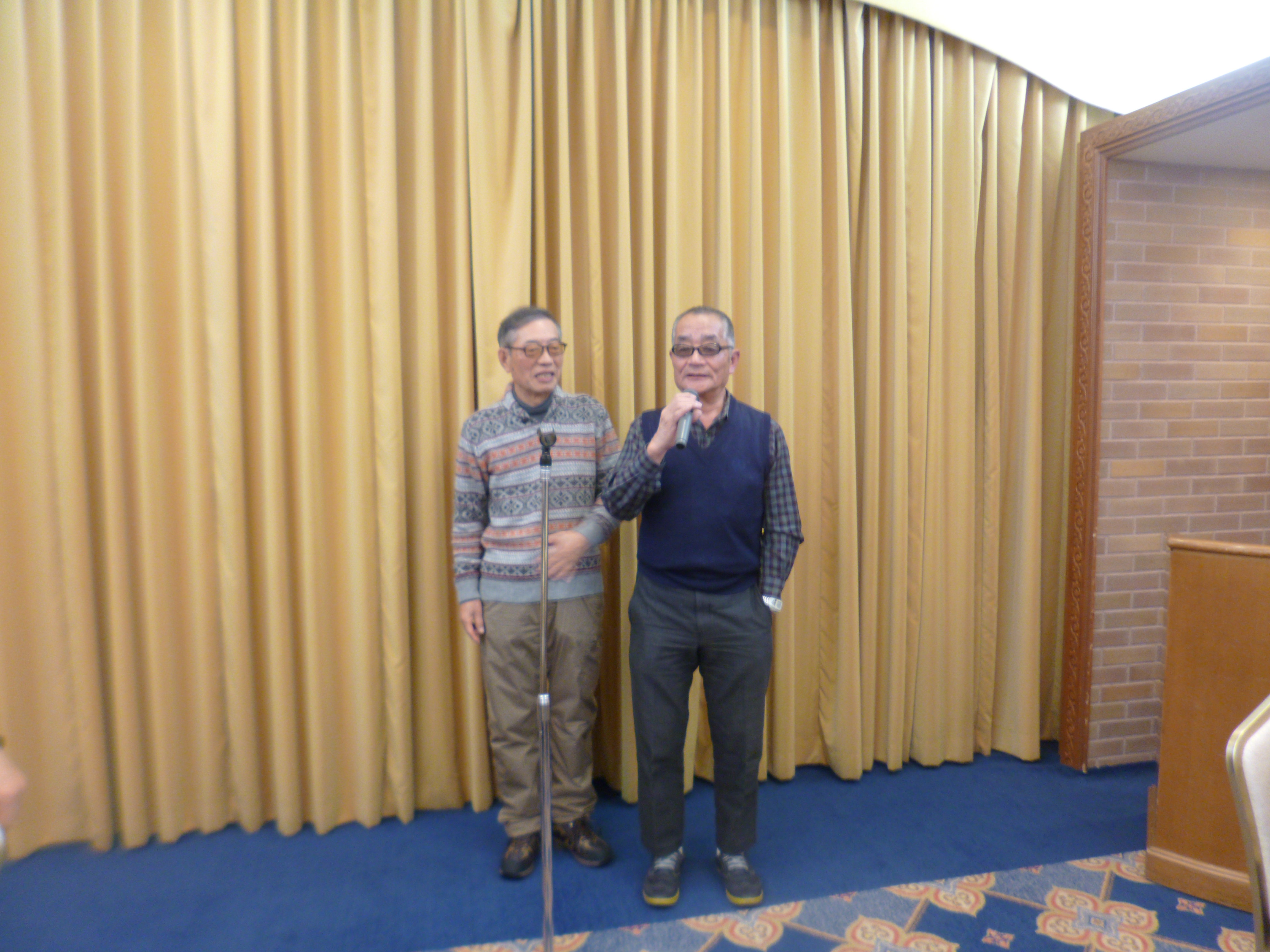 宴は、大西俊雄支部長の挨拶から始まったが、その中には昨年に鬼籍に入られ、名古屋地区でも活躍された二人の紹介があった。それは、田代正彦さんと浅野迪裕さん。支部長の発声で全員での黙祷をし御冥福祈った。