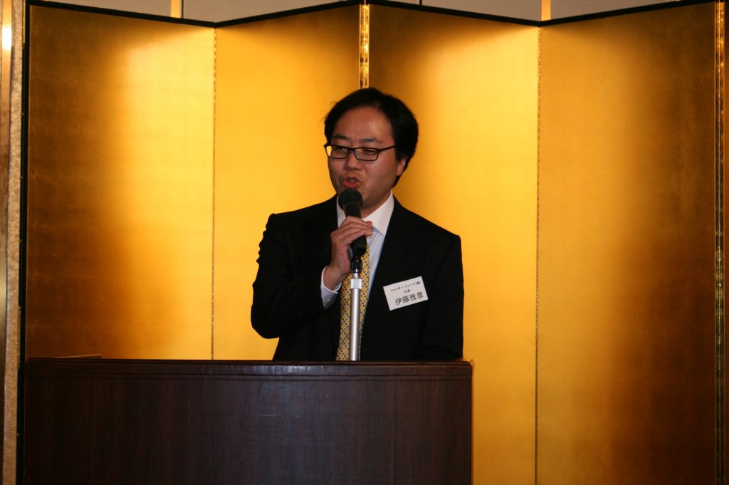 受付風景、開会前の会場の様子、司会の水野年生さん、開会の挨拶の神谷明良、社友会会長佐藤忠夫さん、ファイザー・ファーマ社長伊藤雅彦さん、企業年金基金平井重信さんです。