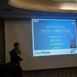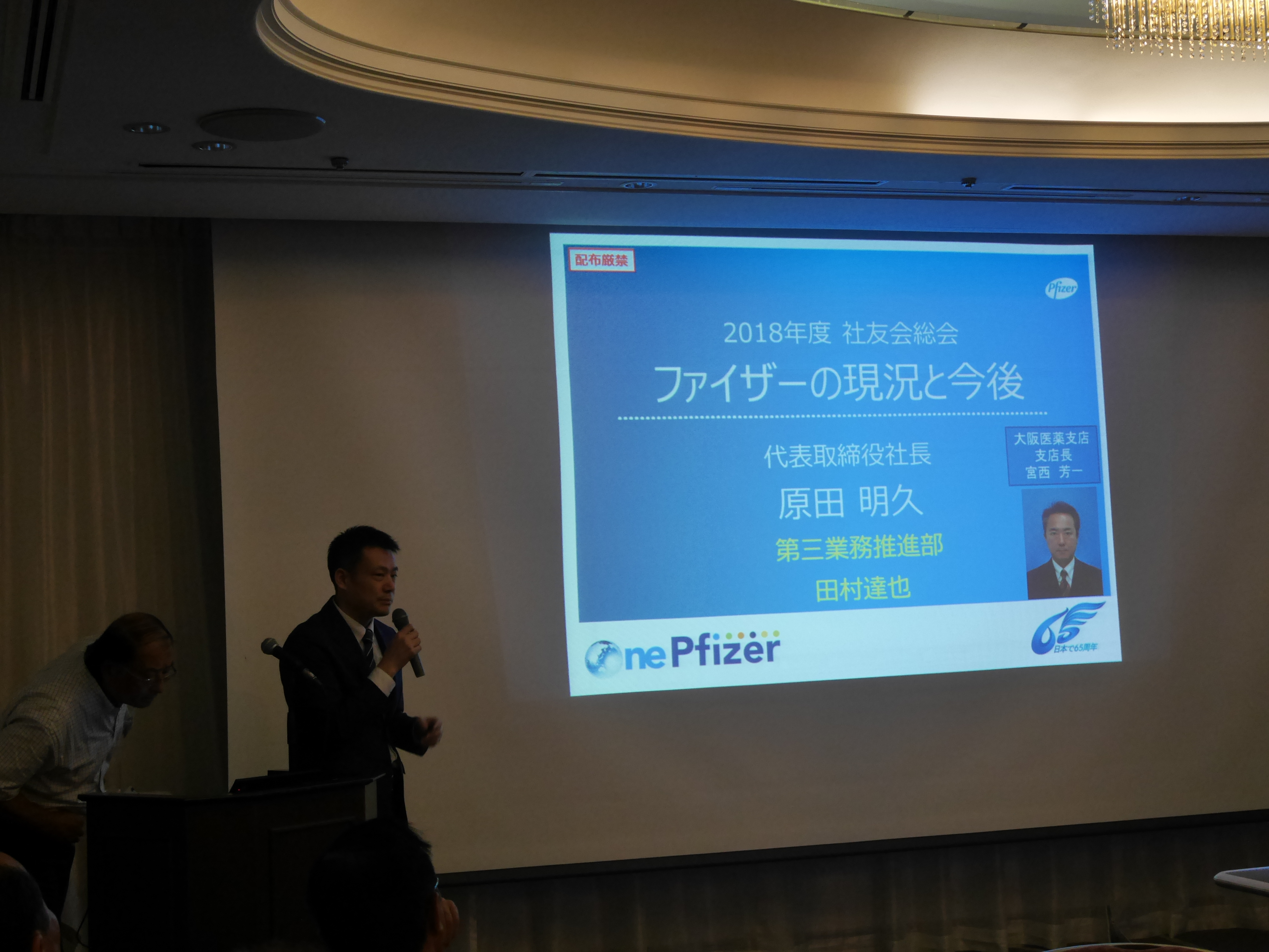 大阪事務所 田村氏からファイザーのグローバル及び日本法人の業績、新薬開発状況、業界の動向などについて説明がありました。昨年度の業績について、グローバルファイザーはロッシュに次いで第2位、ファイザー日本は4423億円の売り上げで対前年-6.6%であったが国内市場では第1位であったとされ、今後毎年薬価改定があるので市場状況は激変するとの予測がありました。