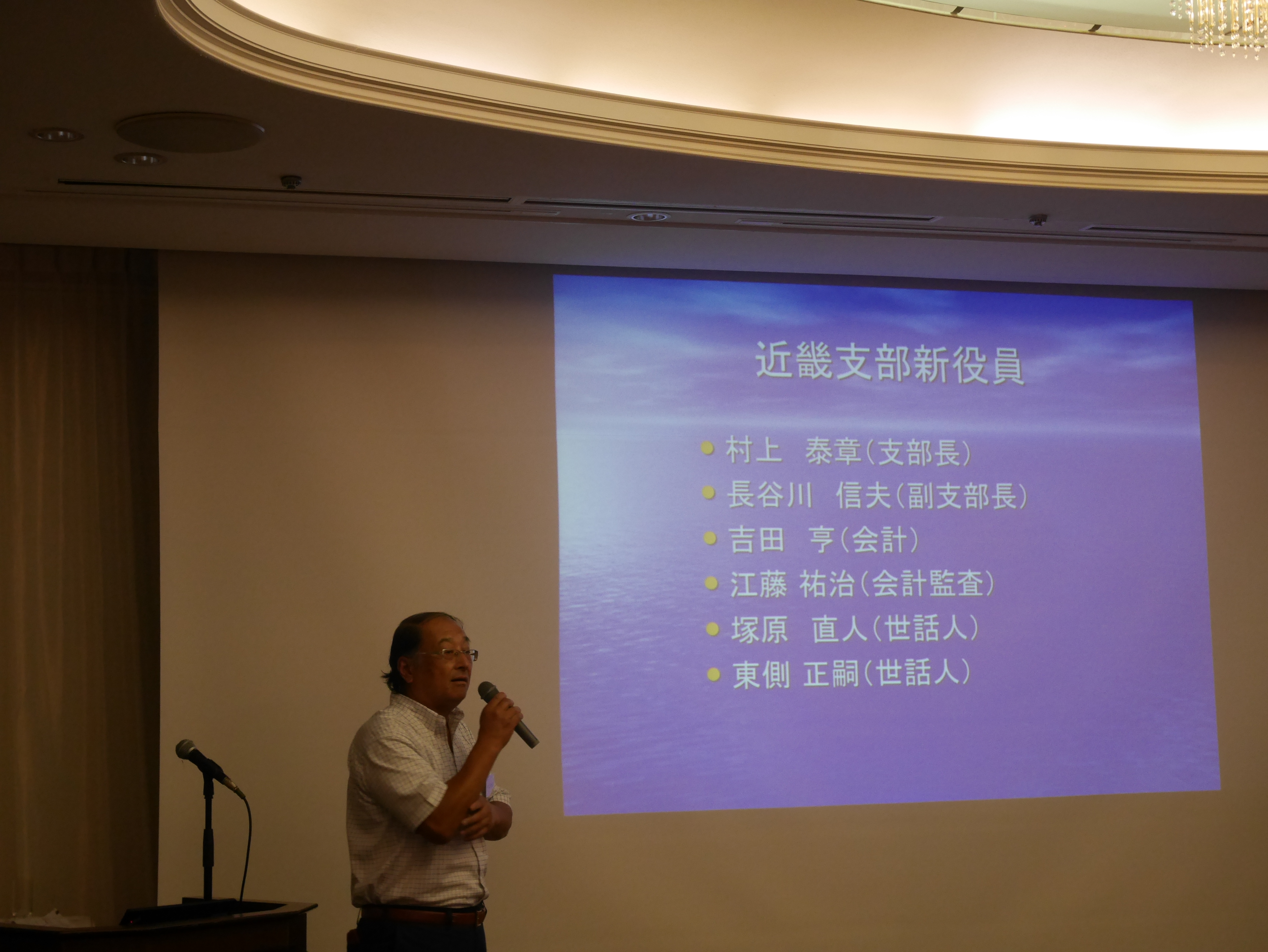 近畿支部役員の任期満了に伴って3名(高橋 豊、原田 孝之、平山 策司の各氏)が退任し、新役員:村上 泰章(支部長)、長谷川 信夫(副支部長)、吉田 亨(会計)、江藤 祐治(会計監査)、塚原 直人(世話人)、東側 正嗣(世話人)が承認されました。