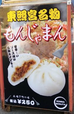 東照宮を出ますとすぐ左に茶店があります。珍しい「もんじゃマン」を全員が食べました。肉まんの中身がもんじゃ焼きです。なかなか美味しかったです。少し休憩しました。