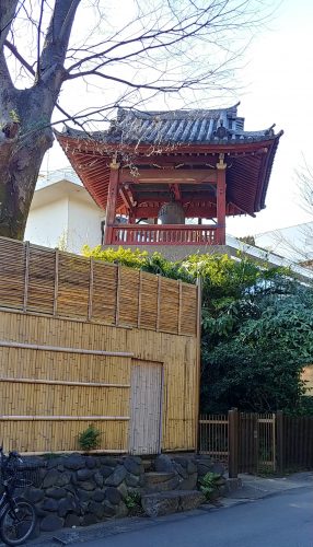 精養軒が見えてくると左の小高い木のかげに時の鐘が見えます。