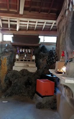 横穴状で天井は高いです。入ると右と正面に祭壇があり賽銭箱は一つです。整備されたので、戦いの跡は見られませんでした。
