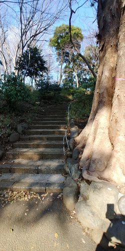 崖にとりついたような階段を行きますと御殿坂に出ます。夕焼けだんだんに続く道です。