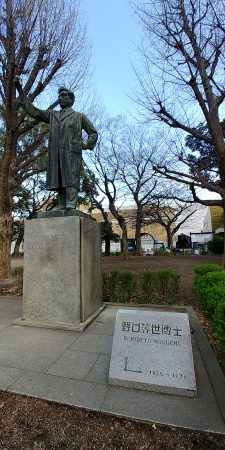 12:00 科学博物館のクジラが見える手前に野口英世銅像があります。