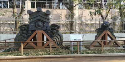 修復時にとりはづした鬼瓦の展示、大きい方は旧本坊表門の物、小さい方は根本中堂に乗せられていた物です。