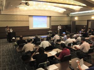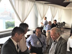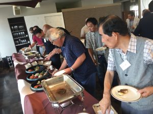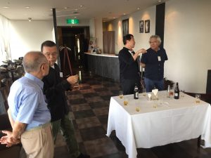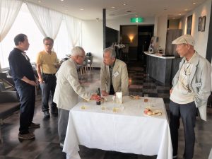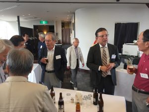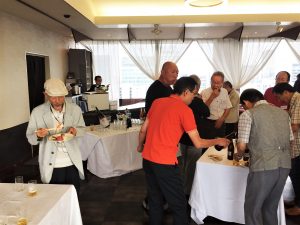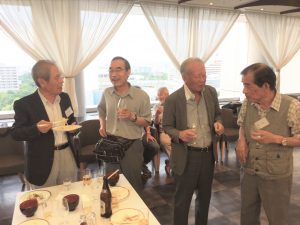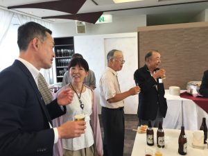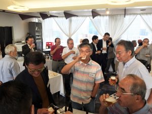 会議終了後は昨年と同様ビル12階の 会場にて懇親会を行いました。来賓のご挨拶の後に本年めでたく喜寿を迎えられた野口武男さんによる乾杯の発声で各テーブルでビールやワインを酌み交わし賑やかに談笑が始まりました。懇親会は立食形式で行いましたが先輩会員の方々の事も考えて会場の周囲に椅子並べ用意していましたが殆どの方が椅子に座ることなく元気に楽しまれているお姿が伺えました。そして懇親会の締めは名古屋支部お決まりの「なも、なも、なも」の名古屋締めを鬼頭支部長の音頭で締め、全員元気で再会することを約束して懇親会をお開きとしました。