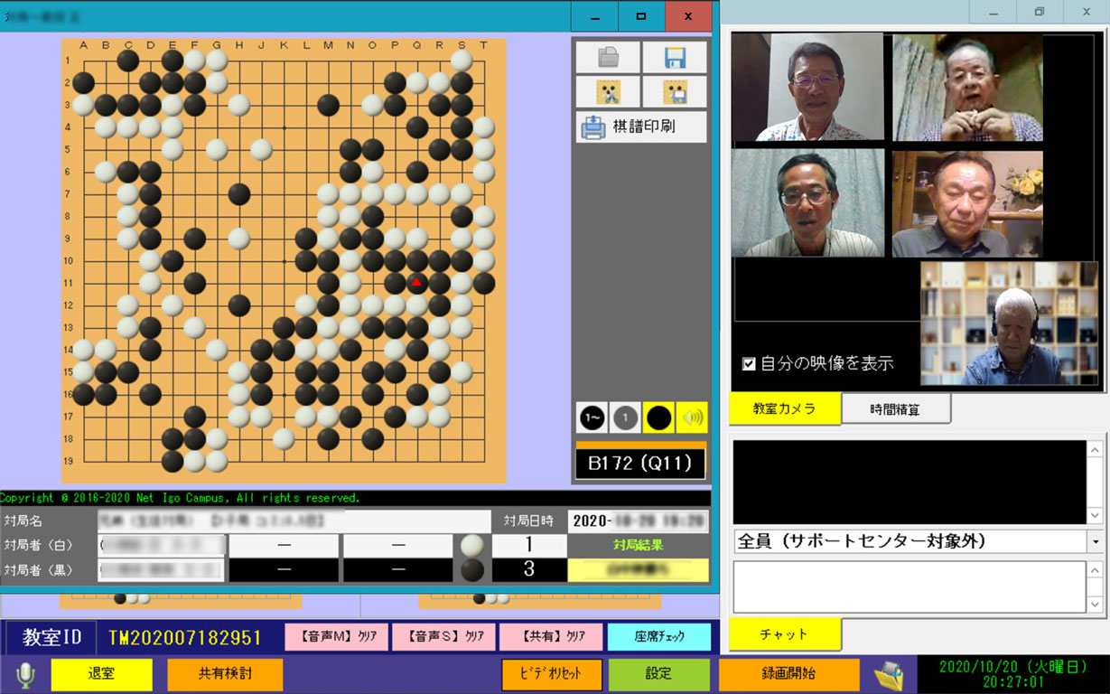 碁仇は憎さも憎し、懐かしし……の諺どおり、囲碁対局ができないとなると無性に打ちたくなるのが人情です。そこで、当節流行のオンラインで対局ができないか調べた結果、「囲碁学園(監修:三村智保プロ九段)」というサイトを見つけました。これをを利用して、「碁酔会」のインターネット囲碁対局場を設定することができました。有料ではありますが一人の負担は軽く、パソコンのカメラとマイクをセットして、お互い顔を合わせて会話しながら対局ができるようになりました。