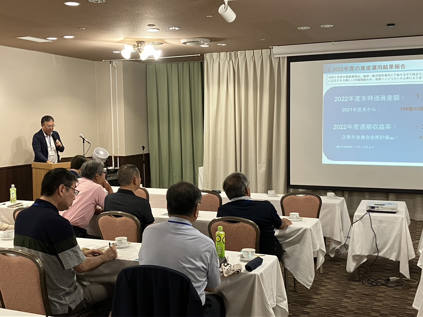 能島副支部長の開会挨拶を皮切りに総会がスタートしました。石井会長が欠席のため代理で星野副支部長が支部長挨拶を代読されました。開催できなかった3年間の物故会員3名様への黙祷、新規入会者17名の紹介、総会初参加者9名の紹介、喜寿会員になられた方の紹介と滞りなくすすめられました。次に馬場副会長様より、コロナ禍の3年間の社友会の現状・社友会会員への行事開催への補助金・今後の社友会運営についての提言等をプレゼンいただきました。次に今井常務理事様より企業年金の現況と将来にわたっての年金基金の健全性についてデータを示していただきながらプレゼンいただきました。最後に東北支部より支部活動報告・支部活動計画・会計報告・会計監査を報告いただき、新役員の改選も無事に終了いたしました。