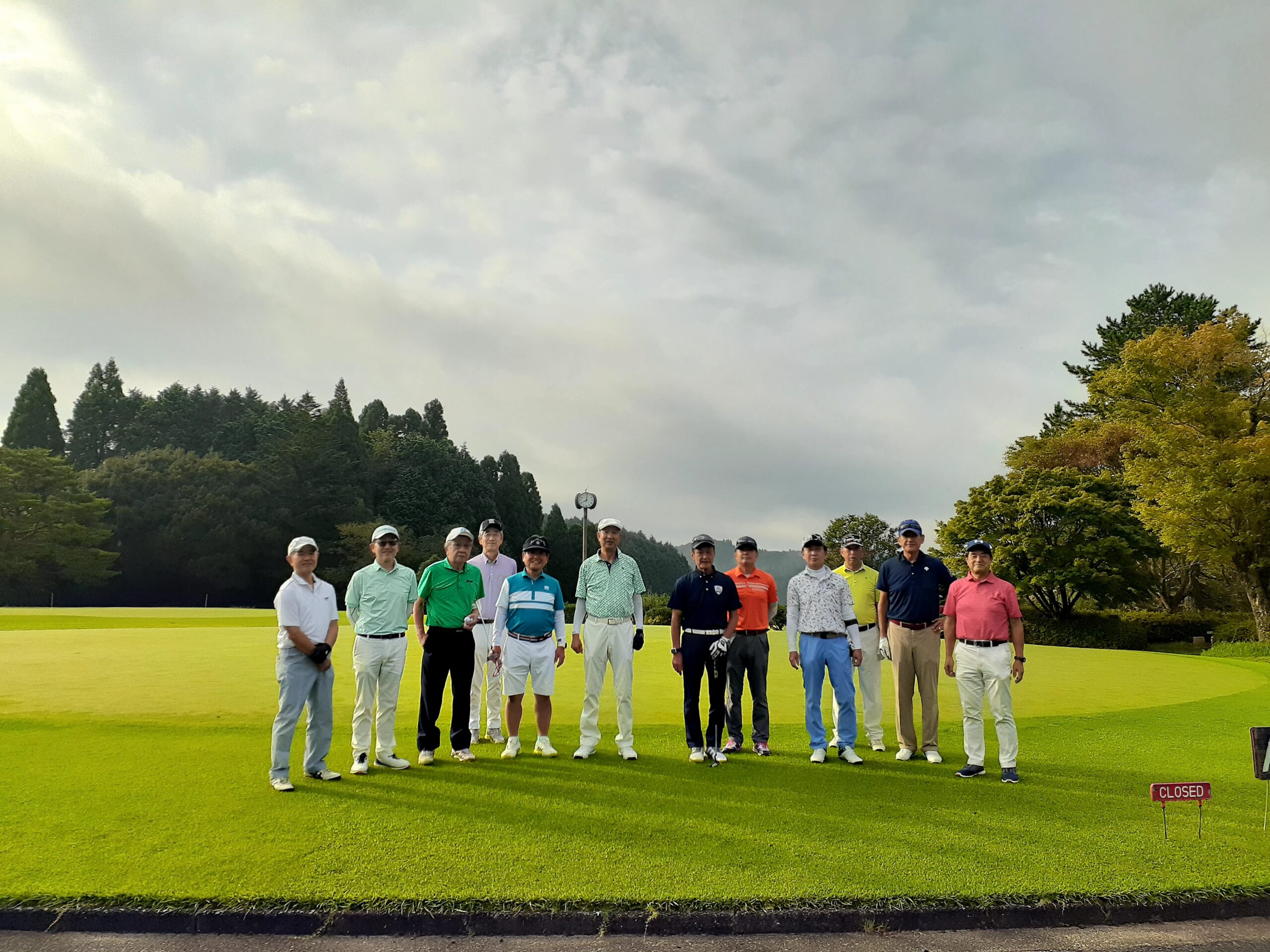 開催日は9月20日、天候は曇りで30℃、湿度は高かったもののプレーしやすいゴルフ日和となりました。参加者は12名で、九州からは福岡県をはじめ、熊本県、鹿児島県、そして遠方では兵庫県、東京からも参加いただき、また初参加の方もいらっしゃって、前日の総会に続き大いに盛り上がりました。