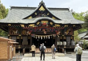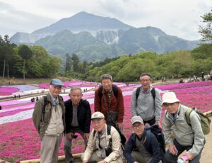 第2日目4月28日、朝食後8時から第3回戦を行い、勝ち数の多い順に対戦しました。成績上位者は、全勝賞;上野昌宏、2勝賞;加藤三郎、宇良芳雄、星谷徹、田柳勝男の各氏でした。旅館をチェックアウト後、秩父の夜祭で有名な秩父神社を参拝しました。この秩父神社は延喜式内社(西暦927年の延喜式に掲載)とされ、秩父(知知夫)国の総鎮守として、関東屈指の古社の一つとして知られていたとのことです。現存する社殿は徳川家康の寄進によるもので、豪華絢爛なる彫刻は参拝する者を圧倒するほどでした。昼食は表彰式も兼ねて、秩父神社近くの人気寿司店「妙見」にて、うな重・特上寿司に舌鼓をうちました。その後、羊山公園の芝桜が満開ということで、希望者8名で行って参りました。数百メートル四方に及ぶピンク、白、紫色などの芝桜は、絨毯を敷き詰めたような見事な美しさでした。帰路は、西武秩父駅までの約20分のウォーキング(一部タクシー)し、予定時刻よりも早く到着したので、幹事を煩わせて1時間早い特急電車にて帰宅の途に着くことができました。