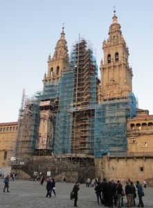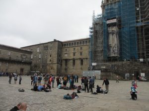 11時半ごろサンティアゴ・カテドラル前のオブラドイロ広場に到着した。広場の真ん中辺りで傍にいた女性に小生のカメラを渡し、カテドラルをバックに小生の写真を撮ってもらった。その時、エルボン修道院まで道連れとなったアングレアが目の前に現れ、ハグしてきた。こうしてお互いの巡礼成就を喜び合った。カテドラルをバックに二人の写真も撮ってもらった。カテドラルは2013年から修復工事が行われてきた。閉鎖しないで工事を進めているので、長期間を要して2020年7月完了の見込み。アングレアと別れて、近くの荷物一時預かり所に2ユーロ支払ってザックを預けた。そして、カテドラルに入って大勢の観光客に混じって巡礼者のためのミサに参加した。