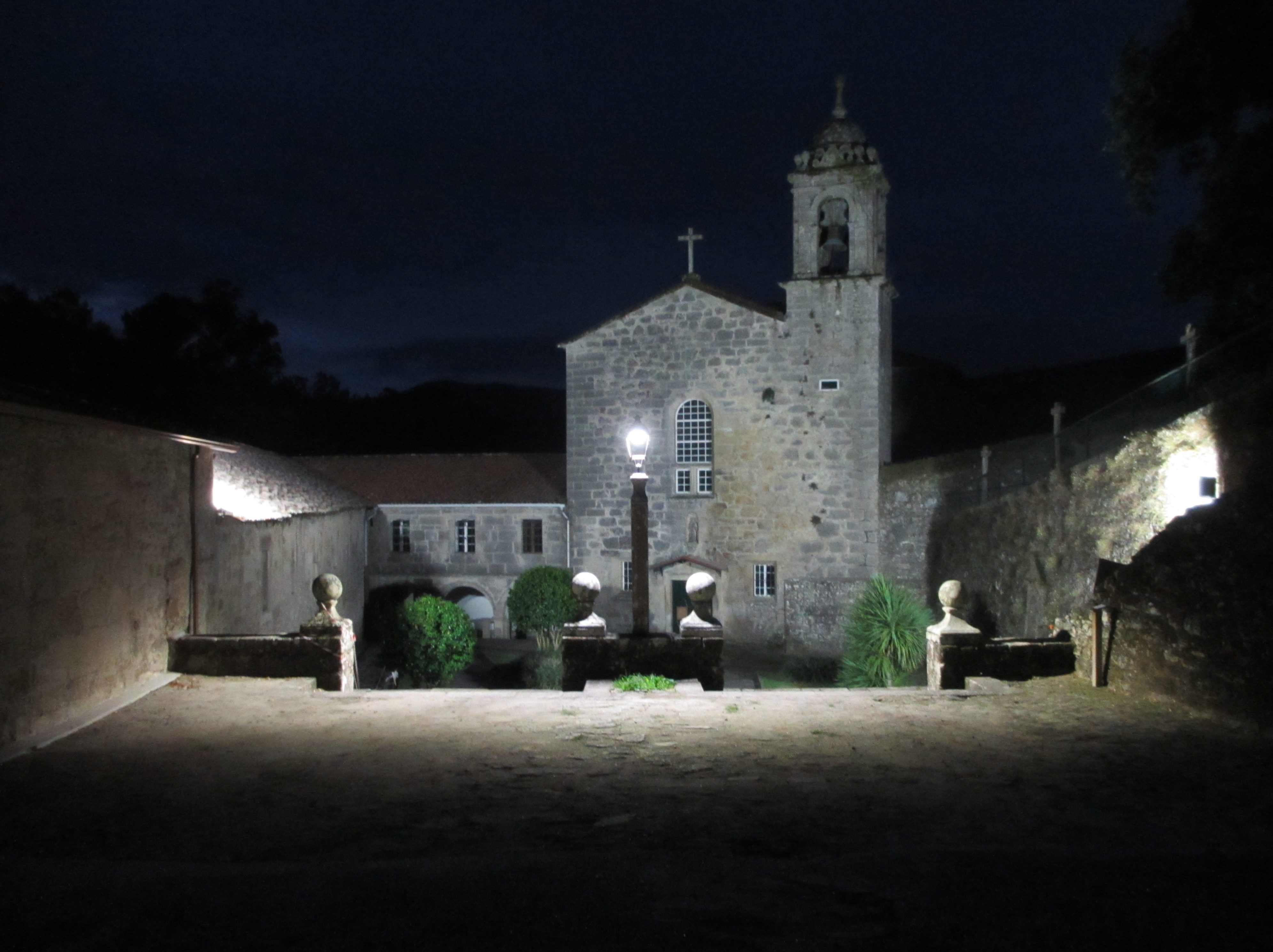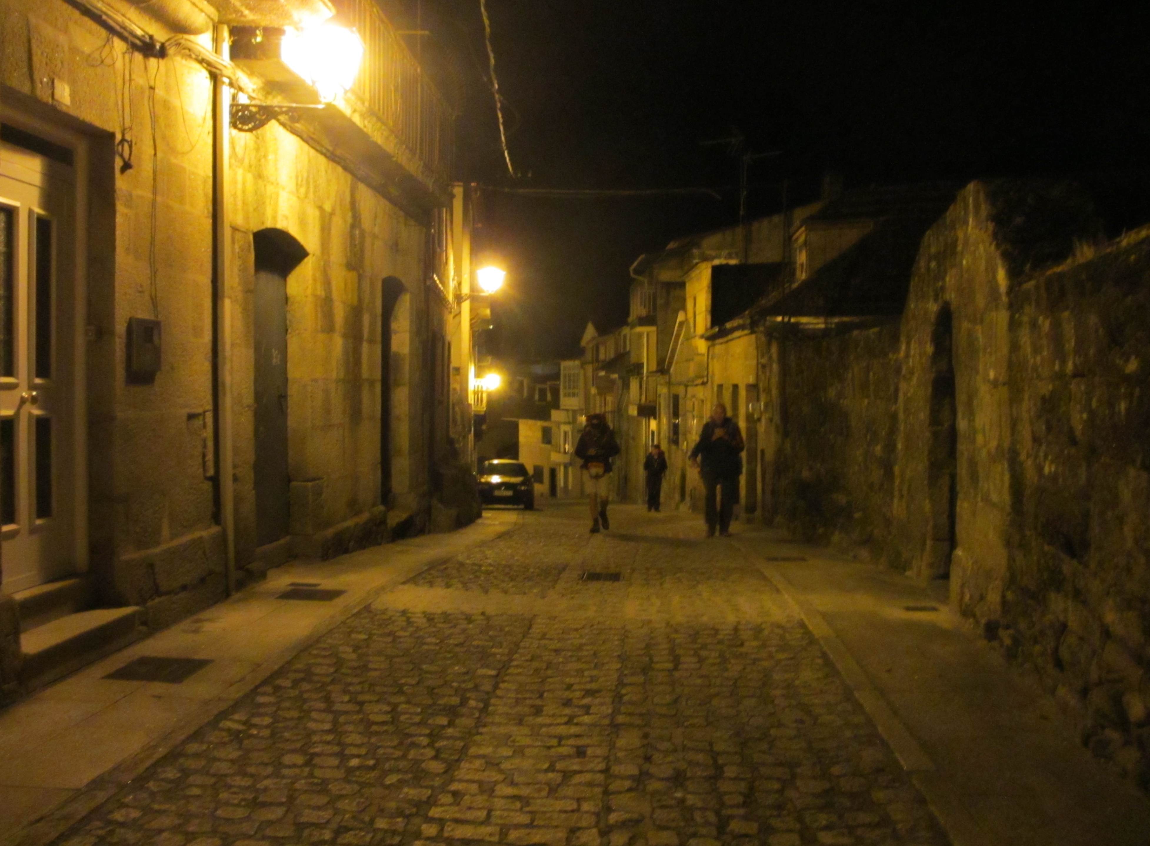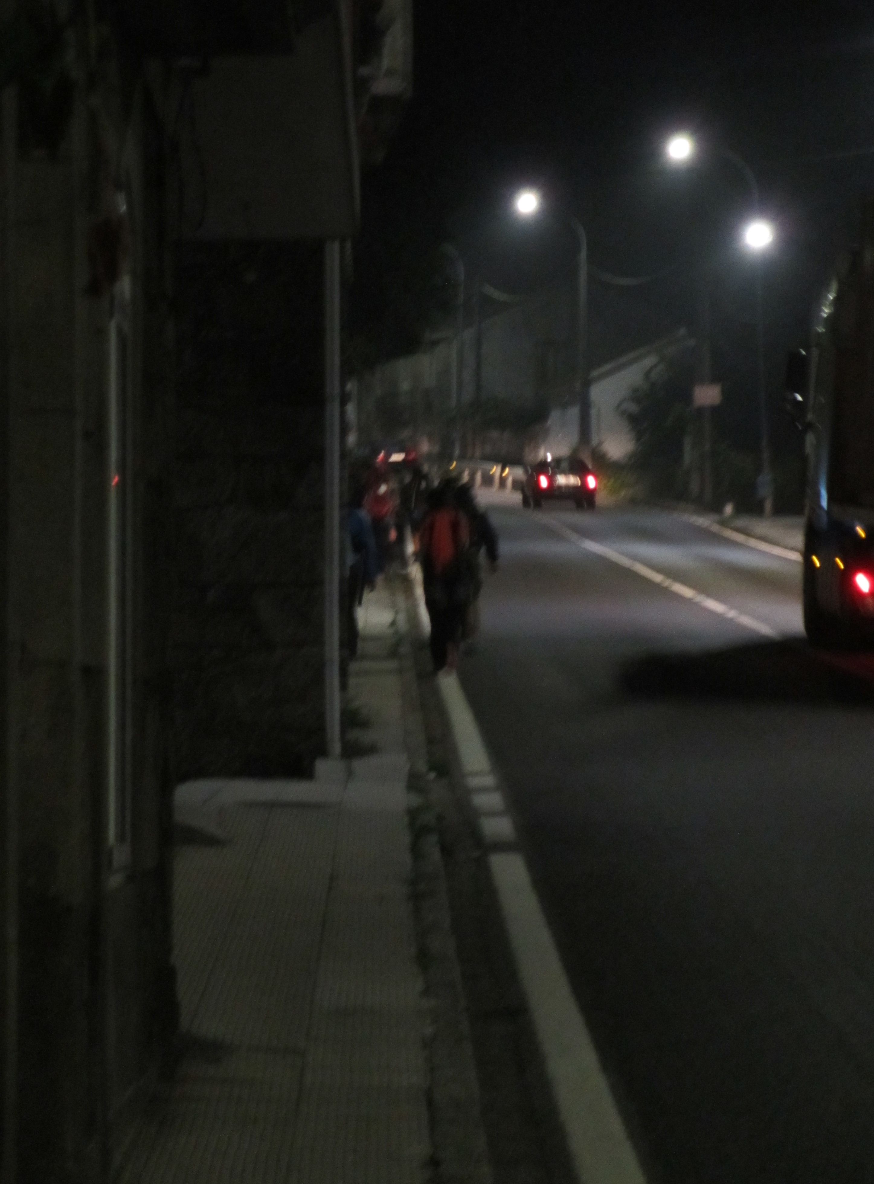 カルダス・デ・レイスのアルベルゲから7時20分ごろ歩き始めて、町なかを進んだ。この後、真っ暗闇の林の中を懐中電灯頼りに歩いた。