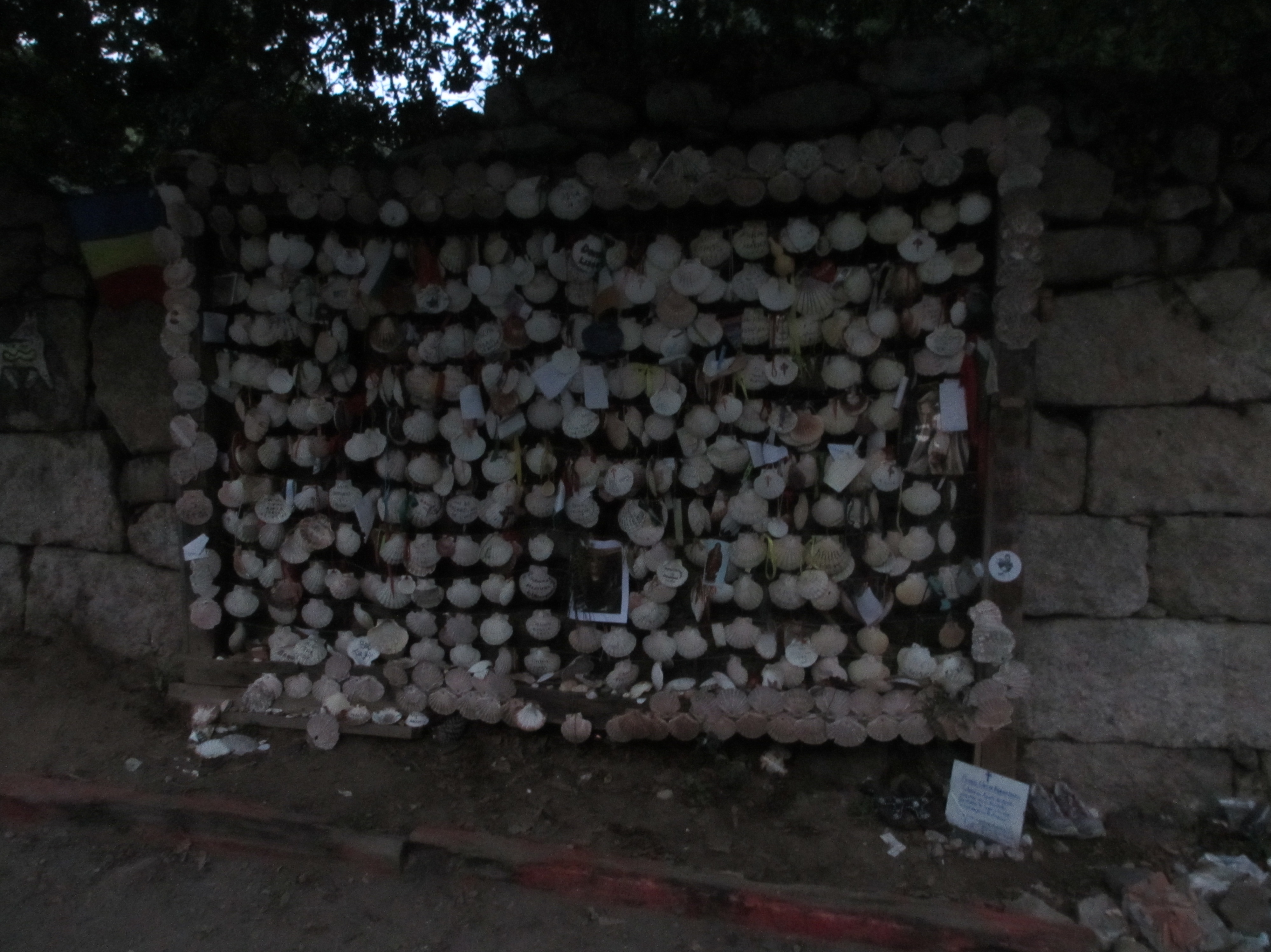 レドンデラ市街を通り抜けて標高153mのアルト・ダ・ロンバに向けて登り坂となった。まだ薄暗いなか、沢山のホタテ貝が吊り下げられていた。通過する巡礼者が掛けたもので、名前と日付が書かれた貝もあった。