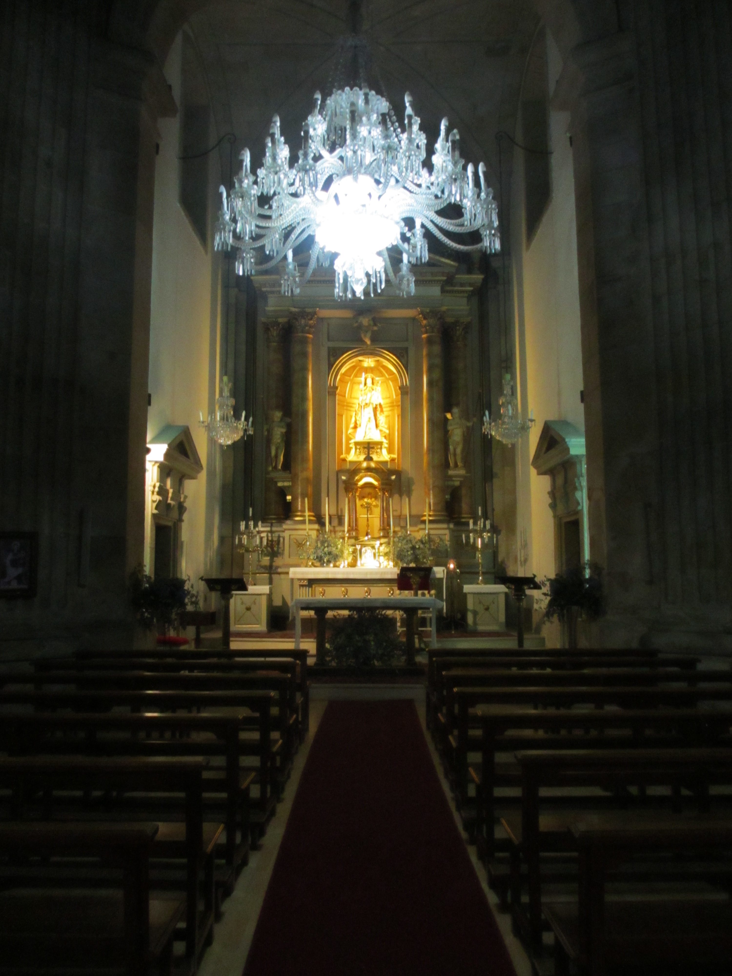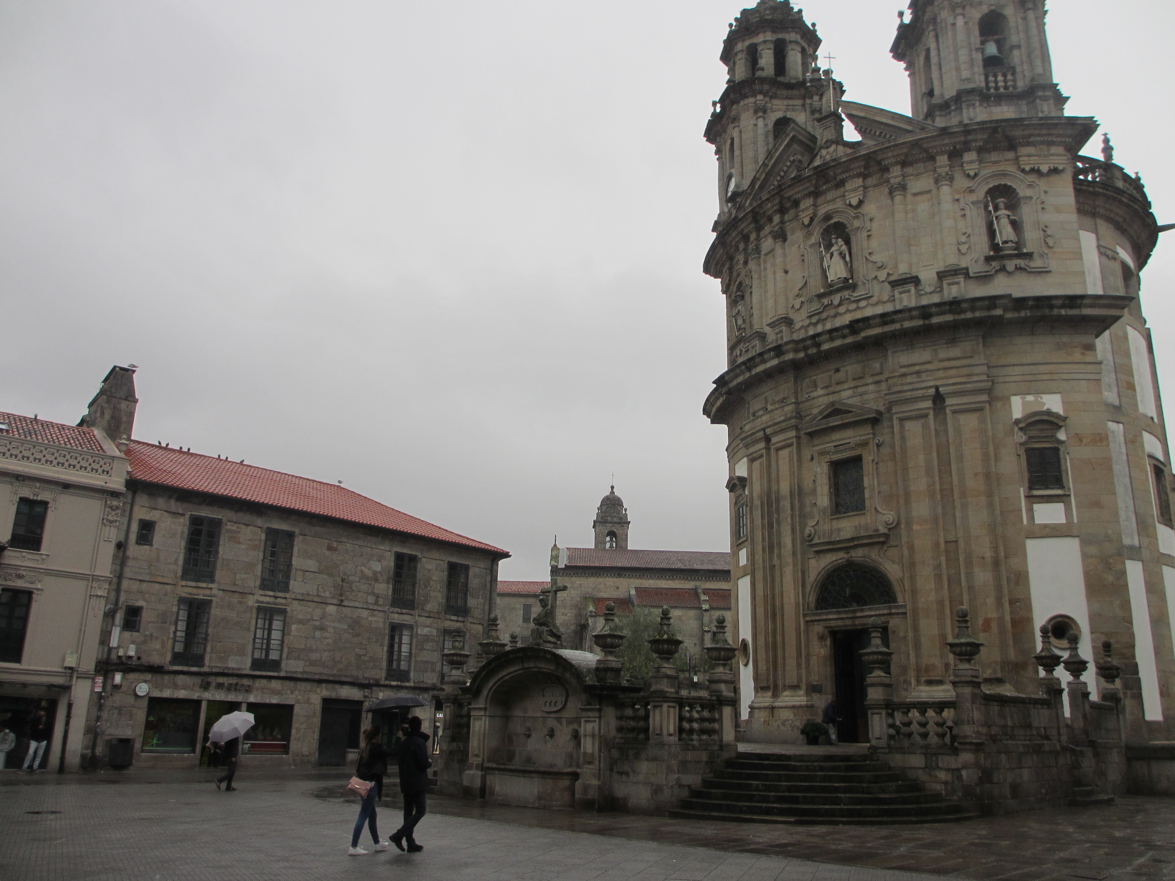 1.5km歩いて中心街へ向かう途中で雨が降ってきた。カペラ・ダス・ペレグリナ(巡礼者礼拝堂)に入った。18世紀の建物だそうで、建物の床面は貝の形をしていると後で知った。祭壇に聖母マリアが巡礼者に扮した像が光り輝いていた。