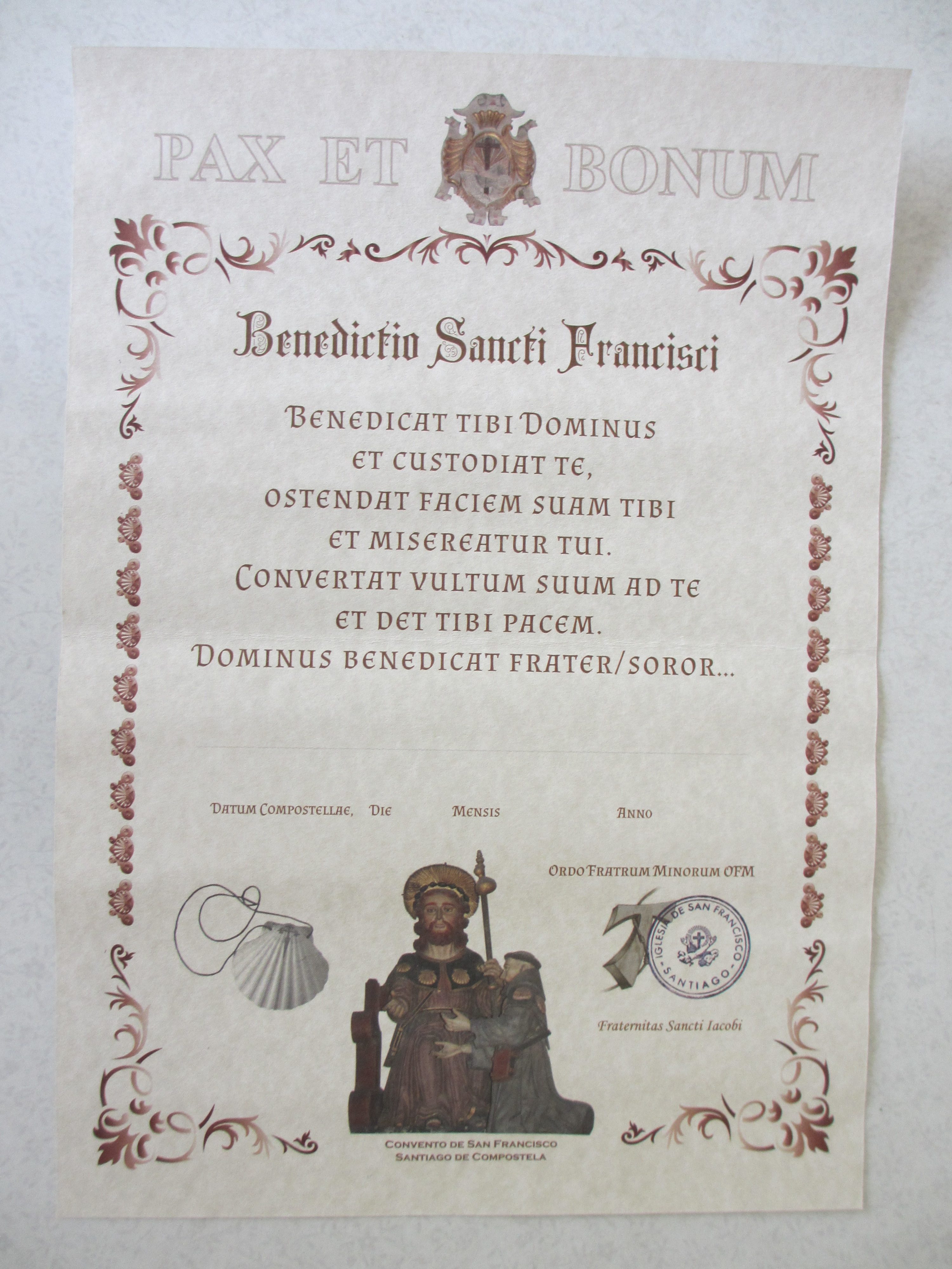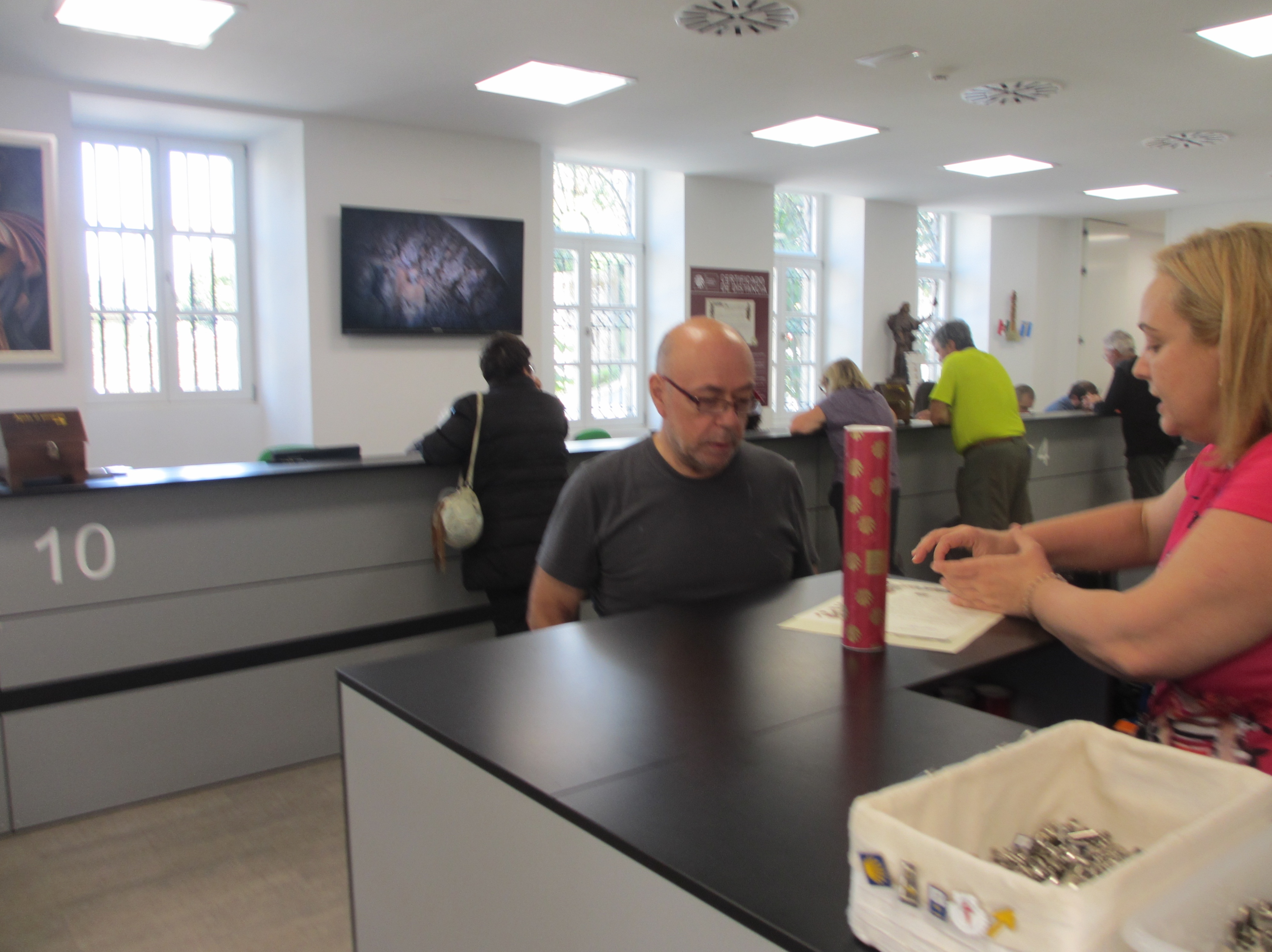 巡礼オフィスはカテドラルの南側から北側に移転していた。午後1時半ごろオフィスを訪れたが巡礼者を応対する大部屋の入口から廊下に長蛇の列がつくられ、列の最後尾は中庭に出ていた。巡礼で忍耐力が鍛えられたのか、長い待ち時間に苛立つような巡礼者はいなかった。2時間近く待たされて、やっと大部屋に呼び込まれた。クレデンシャル(巡礼手帳)を提示して、コンポステーラ(巡礼証明書)が渡された。カウンターには確か20人の巡礼者と同時に対面できるように番号が付けられていたが、現に巡礼者と対面してたのはたったの5つのカウンターだった。小生に3,4分時間を割いたので多分150人ほどの列だったのだ。こうして苦労して入手したコンポステーラ、紙ぺらではあるものの有難く、クレデンシャル、四国遍路の納経帳と共に小生の棺桶に納めてもらっても悪くないなと思った。