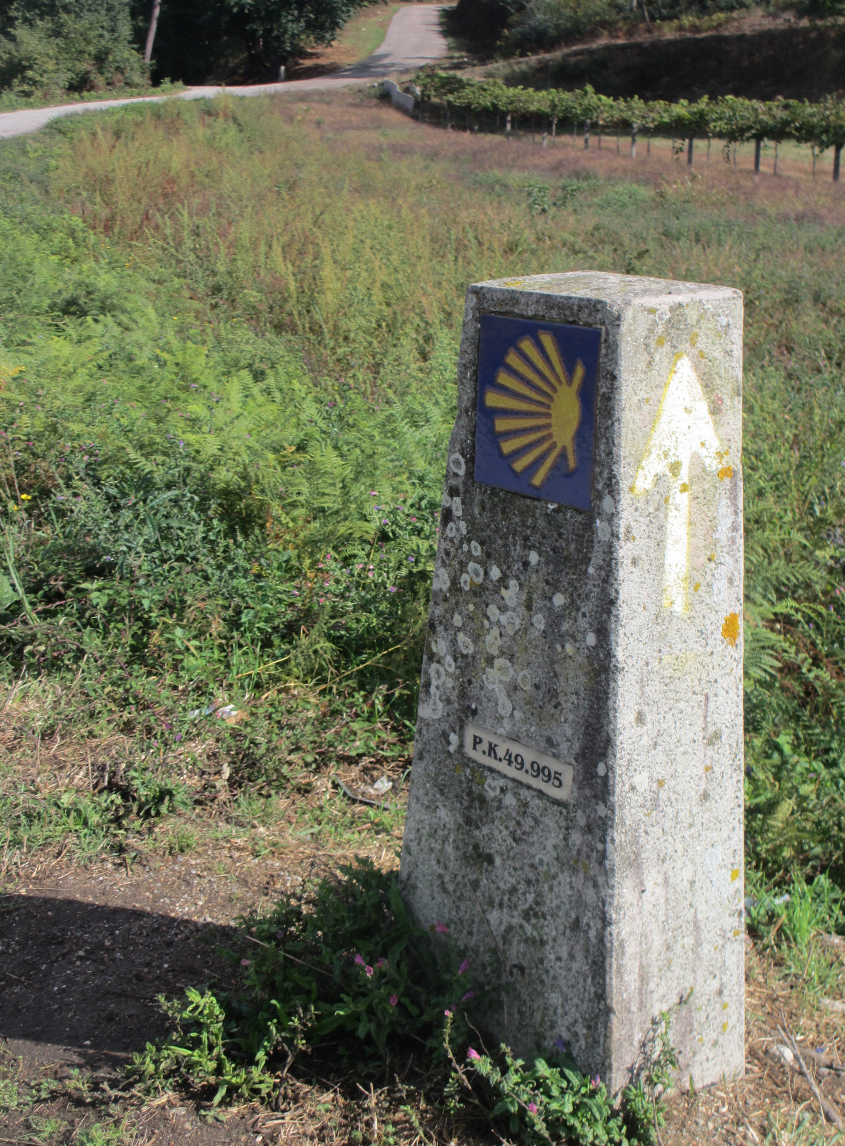 道標に「サンティアゴまで49.995km」の表示。ガリシアではどの道標にも1メートル単位の距離で表示されている。もっと大雑把な数字でも構わないのに。