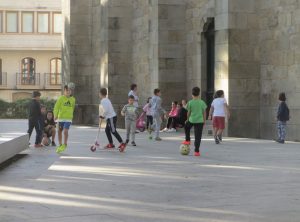 教会前の広場で子供たちが遊んでいた。スペインでは、町なかの小さな公園や広場で親が見守るなか、子供たちが遊んでいる光景をよく見かけた。