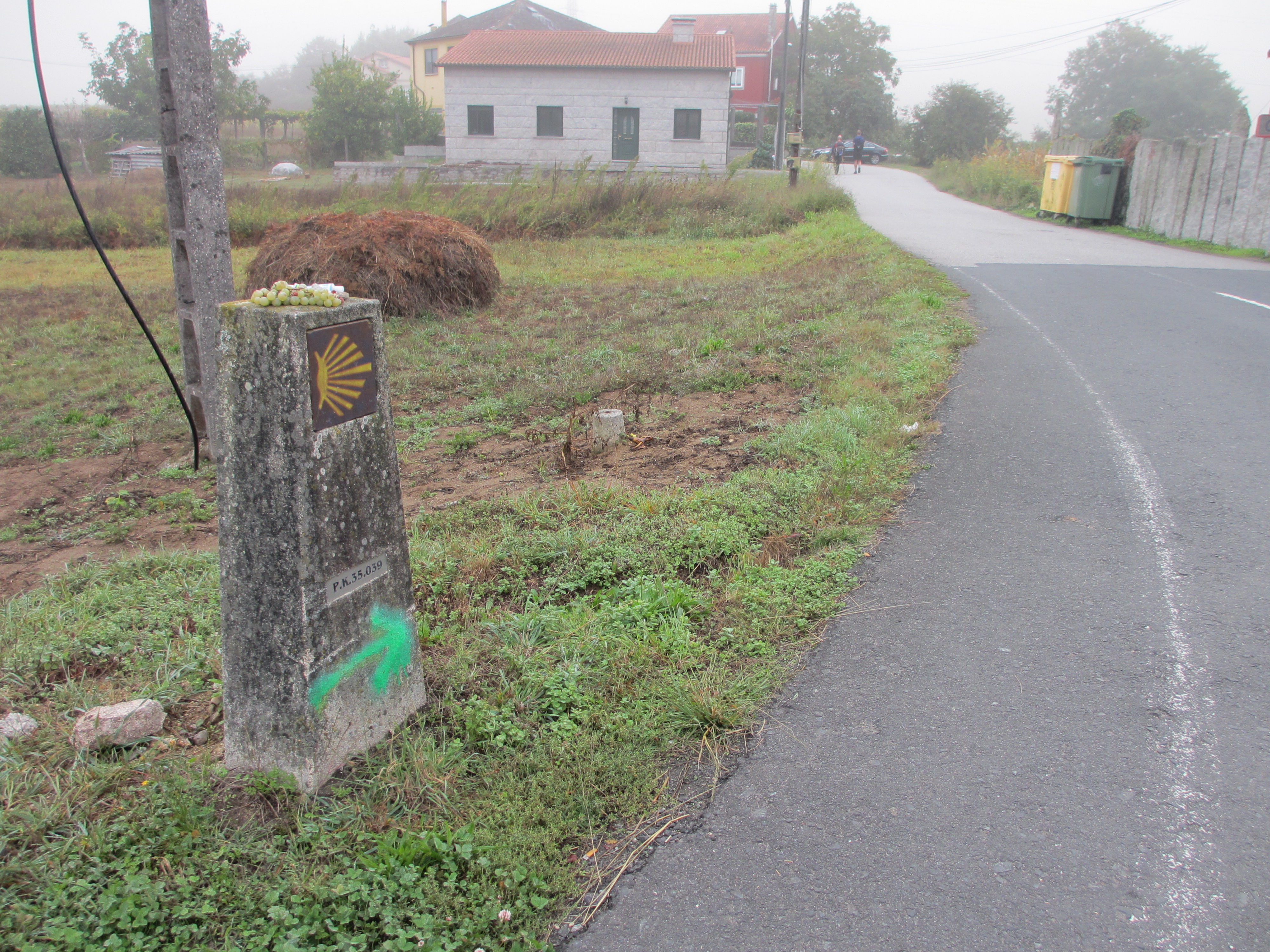 道標にサンティアゴまで35.039km。矢印が黄色でなく青みがかっているではないか。