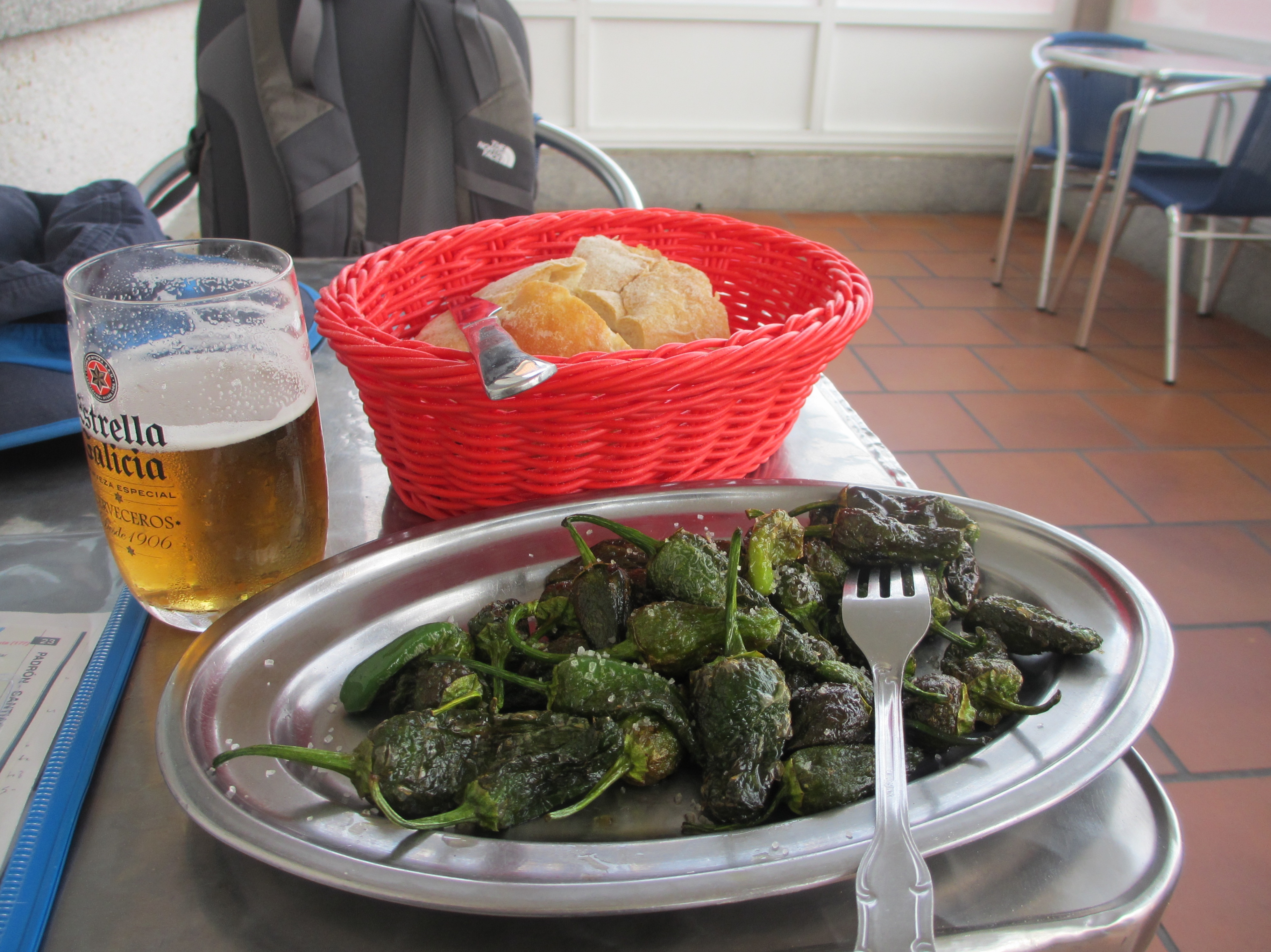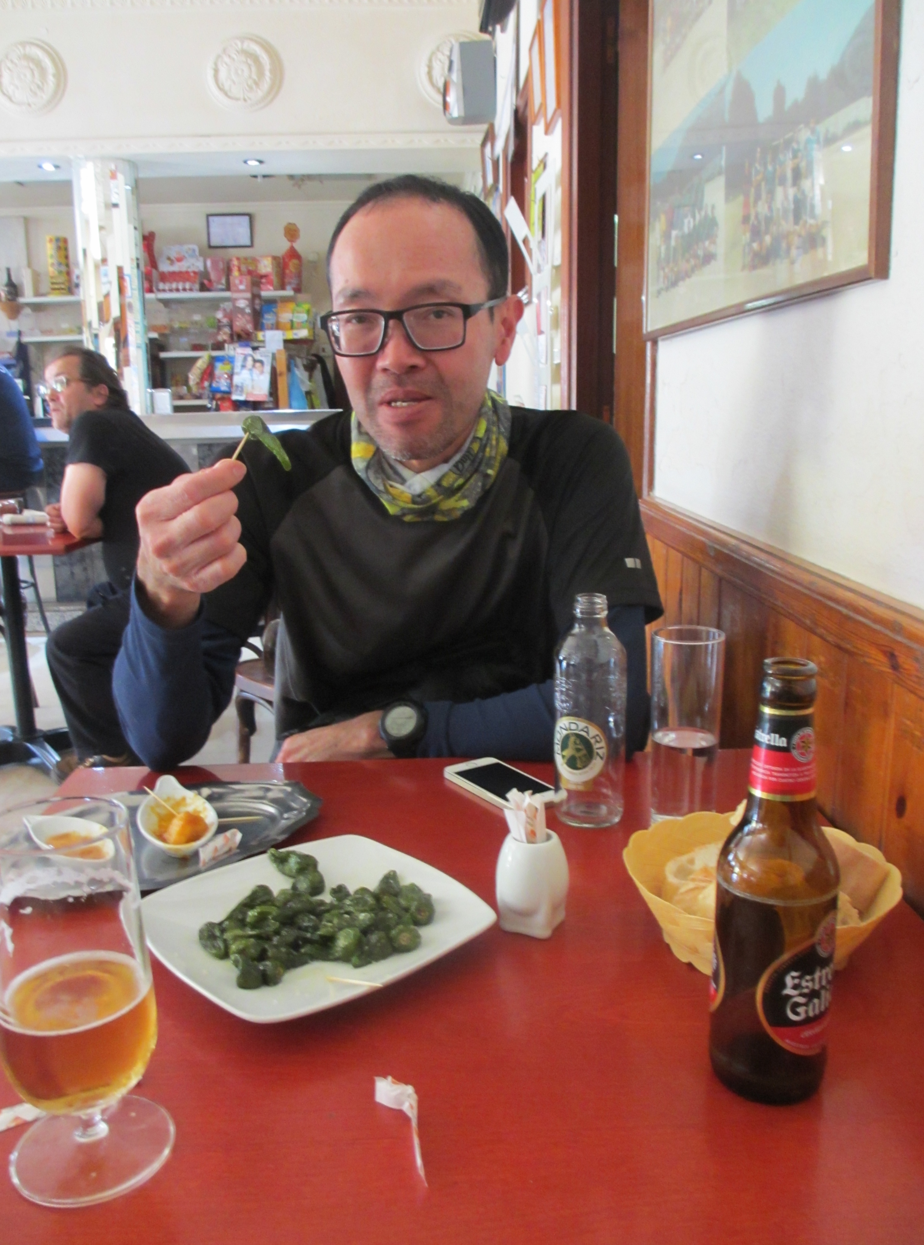 アルベルゲのオープンを待っていたイギリス人のアレックスが、1km離れたところにあるバルに誘ってくれた。アレックスはマレーシアで生まれて、5歳のときに両親に連れられてイギリスに移住したそうだ。30才前後に見えた。彼は4年前に日本を訪れ、熊野古道を歩いたそうだ。帰国後、交わしたメールによると彼はスーパーマーケットで働いているようだ。一緒にビールを飲んだ。彼が、おつまみにピミエントス・デ・パドロンを頼んでくれた。