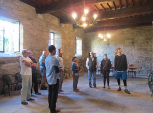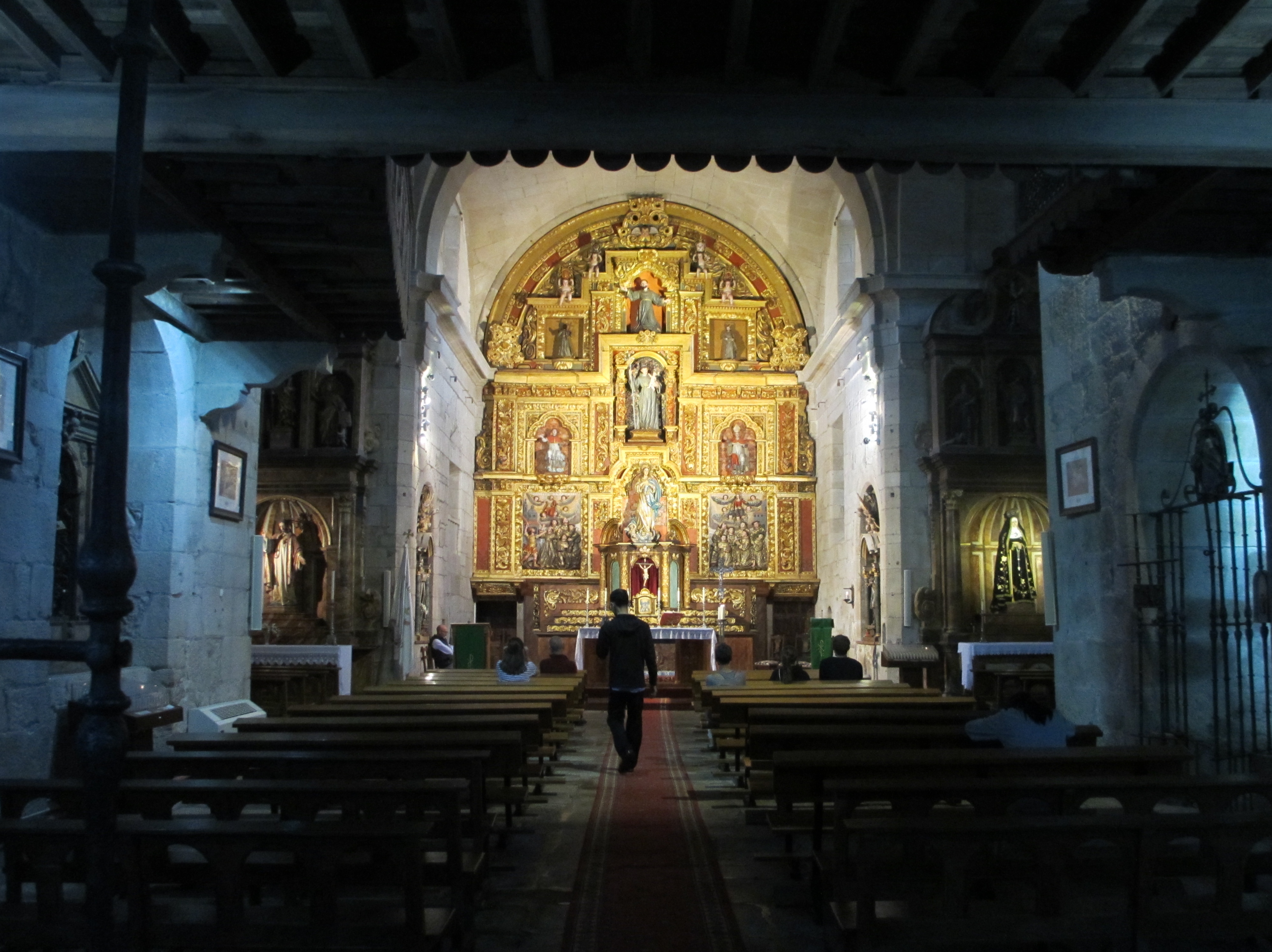 右から3人目がボランティアの案内人。案内人のスペイン語による説明を右から2人目の女性(巡礼者のひとり)が英語に通訳してくれた。ところが、小生はスペイン語も英語も一言も聞き取れず、ちんぷんかんぷんだった。(Webページに)この修道院は1396年に創建されたとあった。