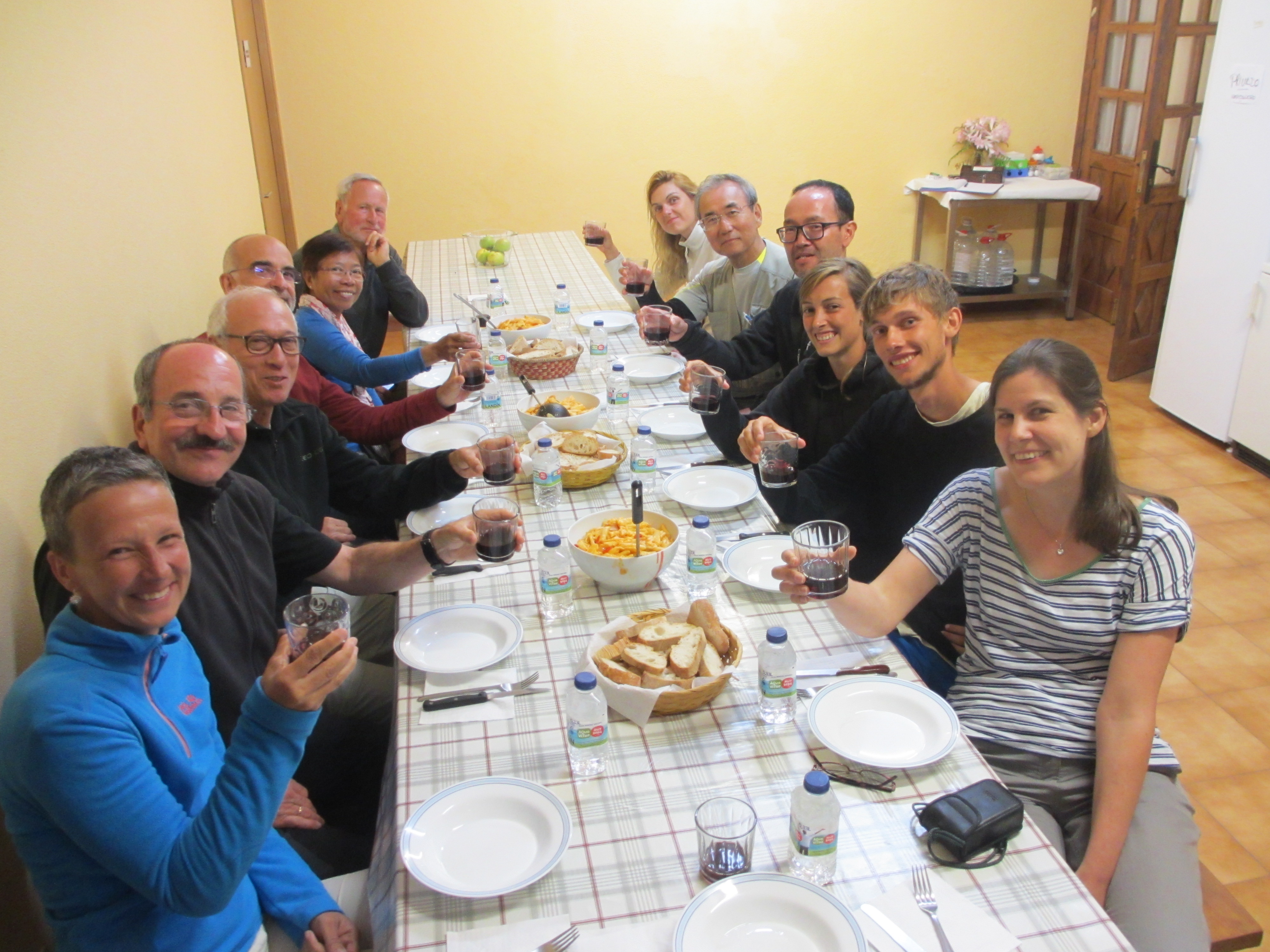 この日泊まった12人の巡礼者がテーブルに着き夕食を摂った。皆揃ってワインで乾杯をした。質素だがコース料理が出された。右手前がアングレット、右手前から4番目がアレックス。