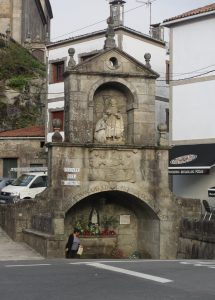 まだ真っ暗な朝8時前にエルボン修道院を出て、2km歩き、夜が明けたパドロンの町に着いた。サンティアゴ教会に入ると「ヤコブ伝説」に纏わる像や絵画が見られた。サール川の橋向の袂にある塔を持った建物がサンティアゴ教会。こんな目立たぬ建物だったので、教会に焦点を絞った写真を撮り損ねた。橋のこちら側にカルメの泉の背面。