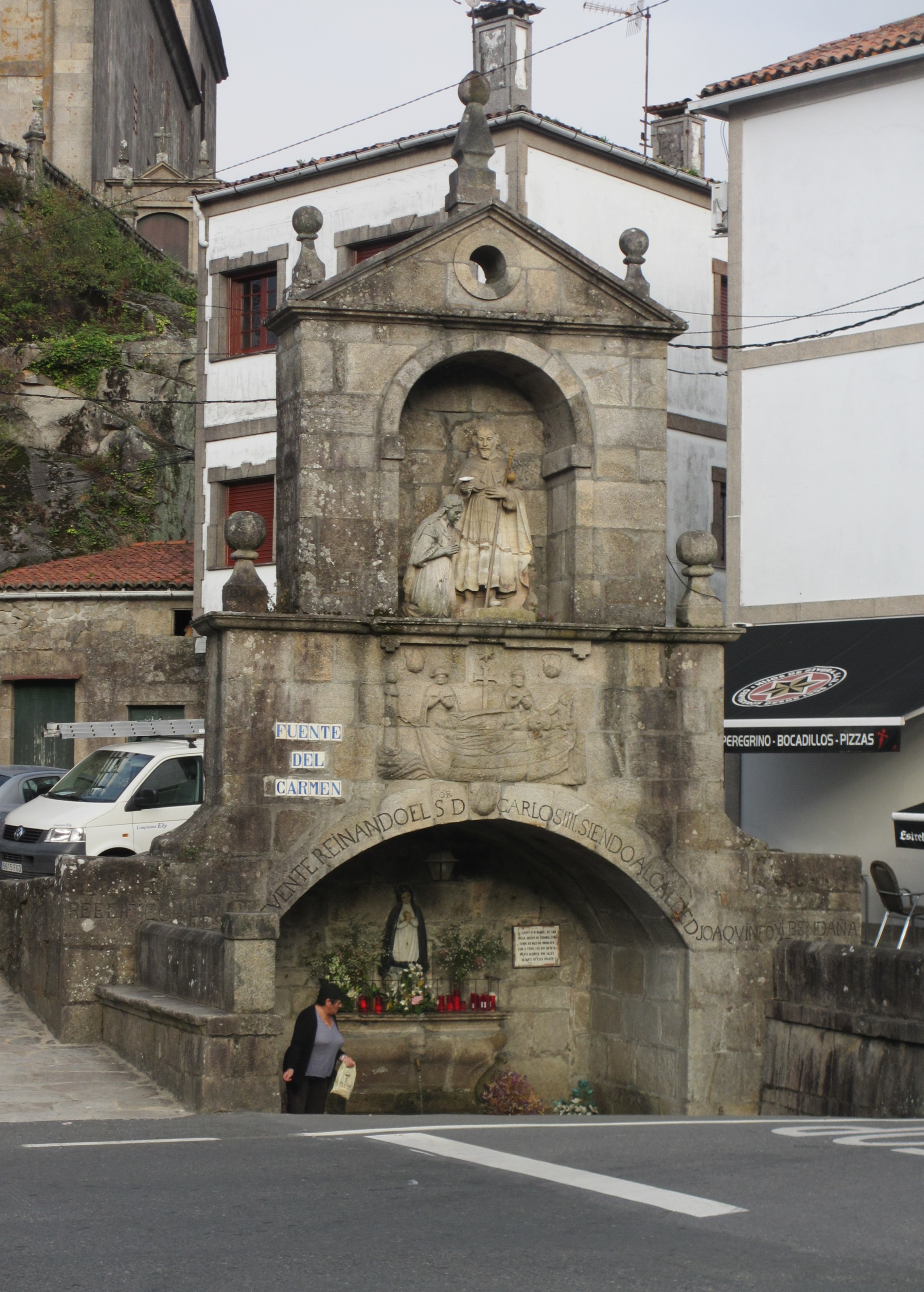 カルメの泉。上:異教徒ルパ女王の改宗と洗礼の場面。中:サンティアゴの遺体を乗せた舟が石に係留されている場面。下:マリア像。女性が祭壇を清掃しているらしい。