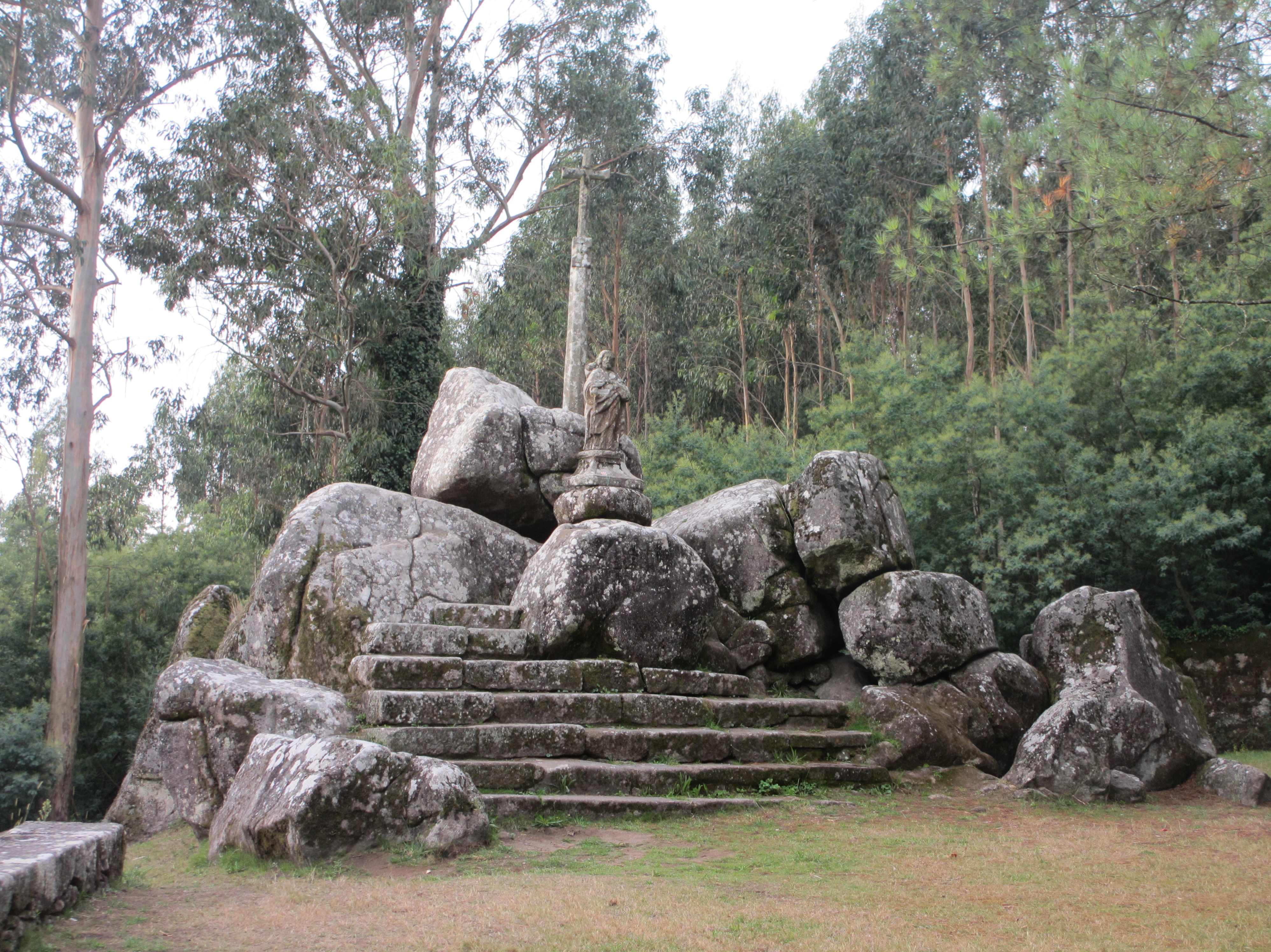 道をどんどん登り、更に階段を登りきると広場に出た。その先に礼拝堂があり、その奥に岩が積まれていた。岩の上でヤコブがスペインで初めてキリストの教えを説いたといわれる。