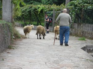 羊の散歩?(地元の人が羊を数頭連れて歩いている光景を何度か見かけた。)を振り返って見る巡礼者