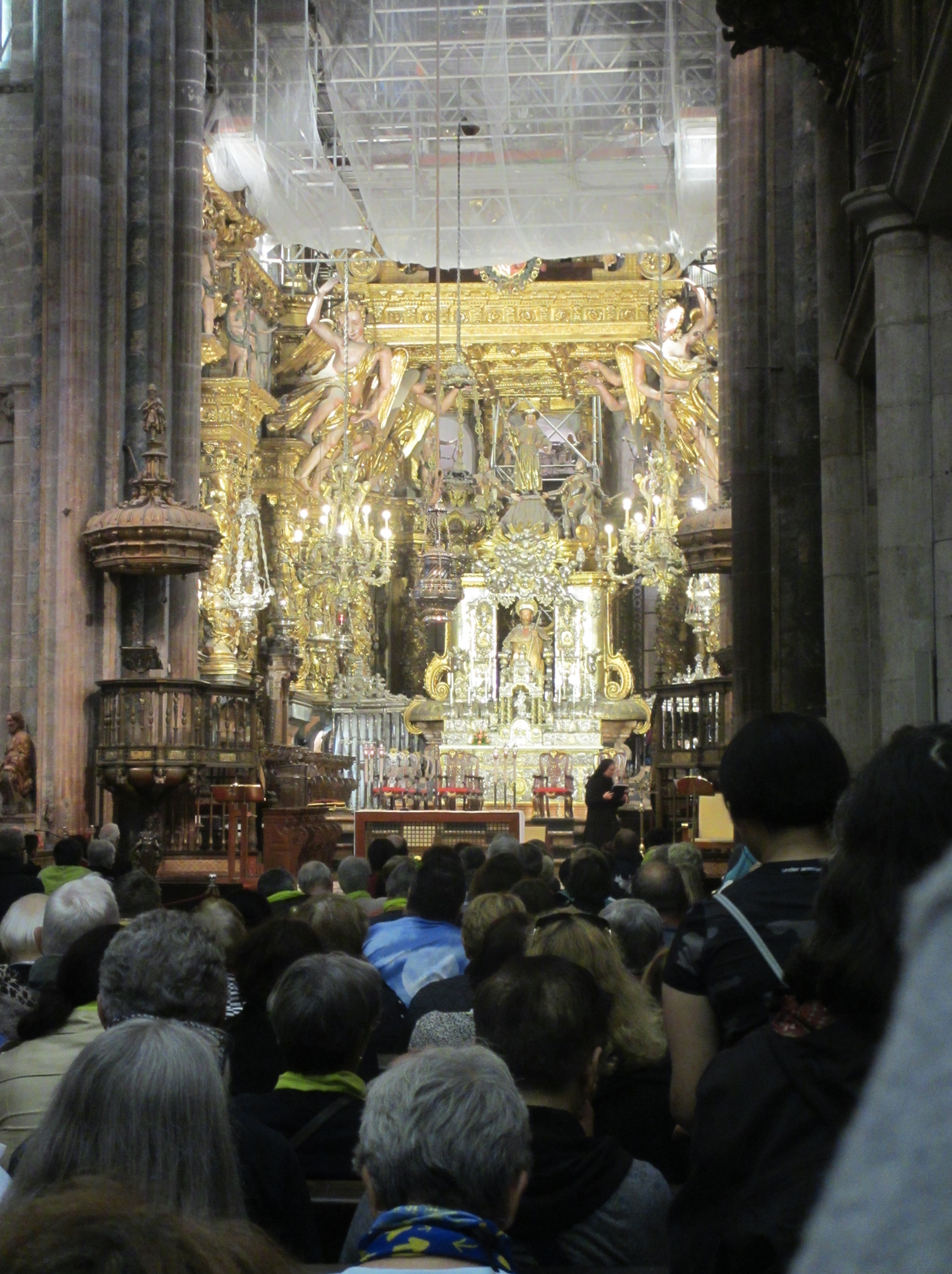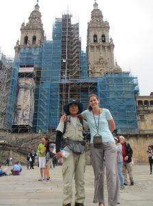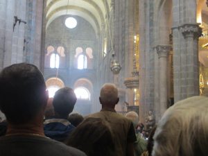 11時半ごろサンティアゴ・カテドラル前のオブラドイロ広場に到着した。広場の真ん中辺りで傍にいた女性に小生のカメラを渡し、カテドラルをバックに小生の写真を撮ってもらった。その時、エルボン修道院まで道連れとなったアングレアが目の前に現れ、ハグしてきた。こうしてお互いの巡礼成就を喜び合った。カテドラルをバックに二人の写真も撮ってもらった。カテドラルは2013年から修復工事が行われてきた。閉鎖しないで工事を進めているので、長期間を要して2020年7月完了の見込み。アングレアと別れて、近くの荷物一時預かり所に2ユーロ支払ってザックを預けた。そして、カテドラルに入って大勢の観光客に混じって巡礼者のためのミサに参加した。
