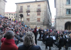 黄昏のカテドラルを見ようと、オブラドイロ広場を訪れた。そして、カテドラルの東側のプラテリアス広場へ回ると、大勢の観客に囲まれてブラスバンドの演奏会が開かれていた。最後に、「ガイダ」と呼ばれるバグパイプ奏者が3人加わって聴き慣れない多分ガリシアのケルト音楽が3曲演奏された。