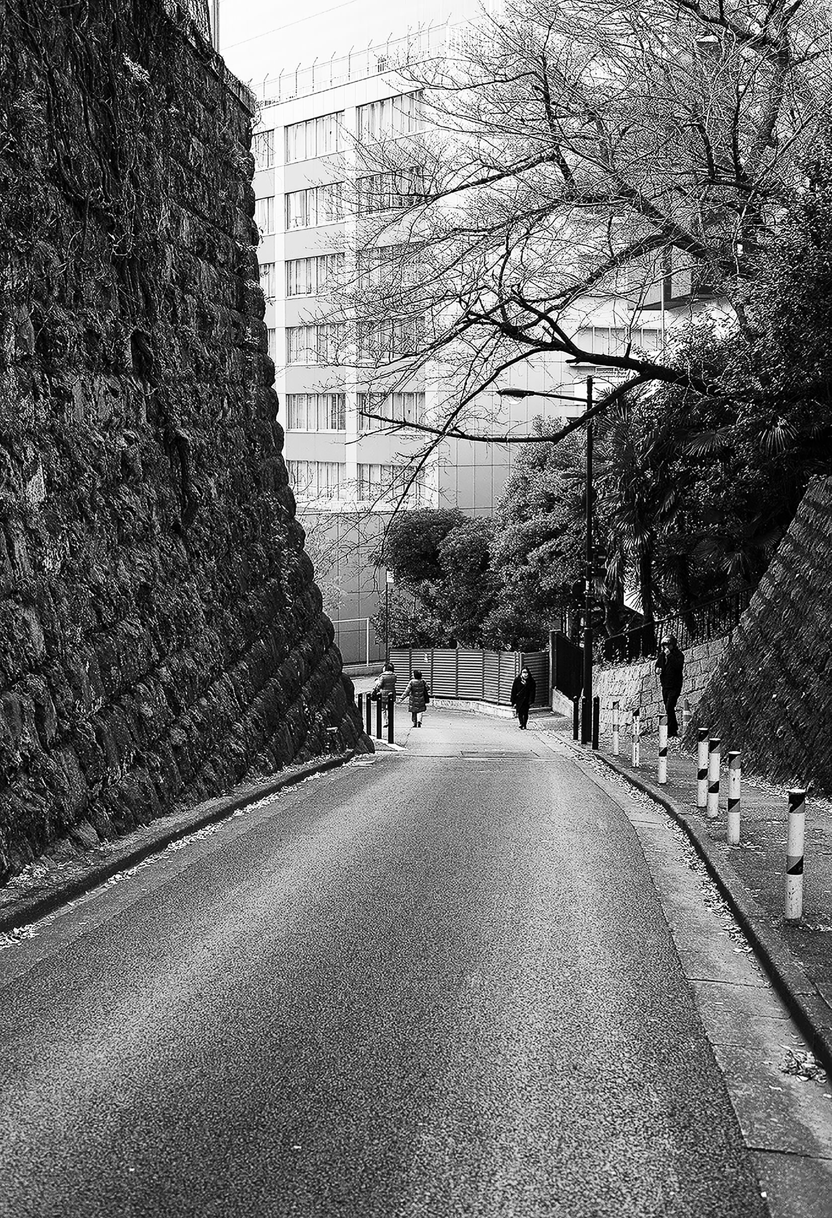 その3:「遅刻坂」千代田区の赤坂見附にある坂で、山王グランドビルとプルデンシャルタワーの間にある狭い坂道です。坂の上の右側に都立日比谷高校、左手にはメキシコ大使館があります。長さは170メートルもありやや急坂です。坂の名前の起こりは、この辺りの官公庁勤めのお役人や日比谷高校の学生達が朝の出勤、登校時にこの厳しい坂を登らなければならないため、よく遅刻することが多く「遅刻坂」の名前で呼ばれるようになったようです。坂の上に表示されている標識柱には「新坂」となっています。しかし、「遅刻坂」の方が、実感がこもっており良い坂名だと思います。この「遅刻坂」の素晴しい景観は片側の日比谷高校側にそそり立っている城壁の様な石垣に包まれていることです。この景色は、他には見られない雰囲気があります。朝、夕に見る坂は、絵に描いたような格別なものです。(ストリートビュー)