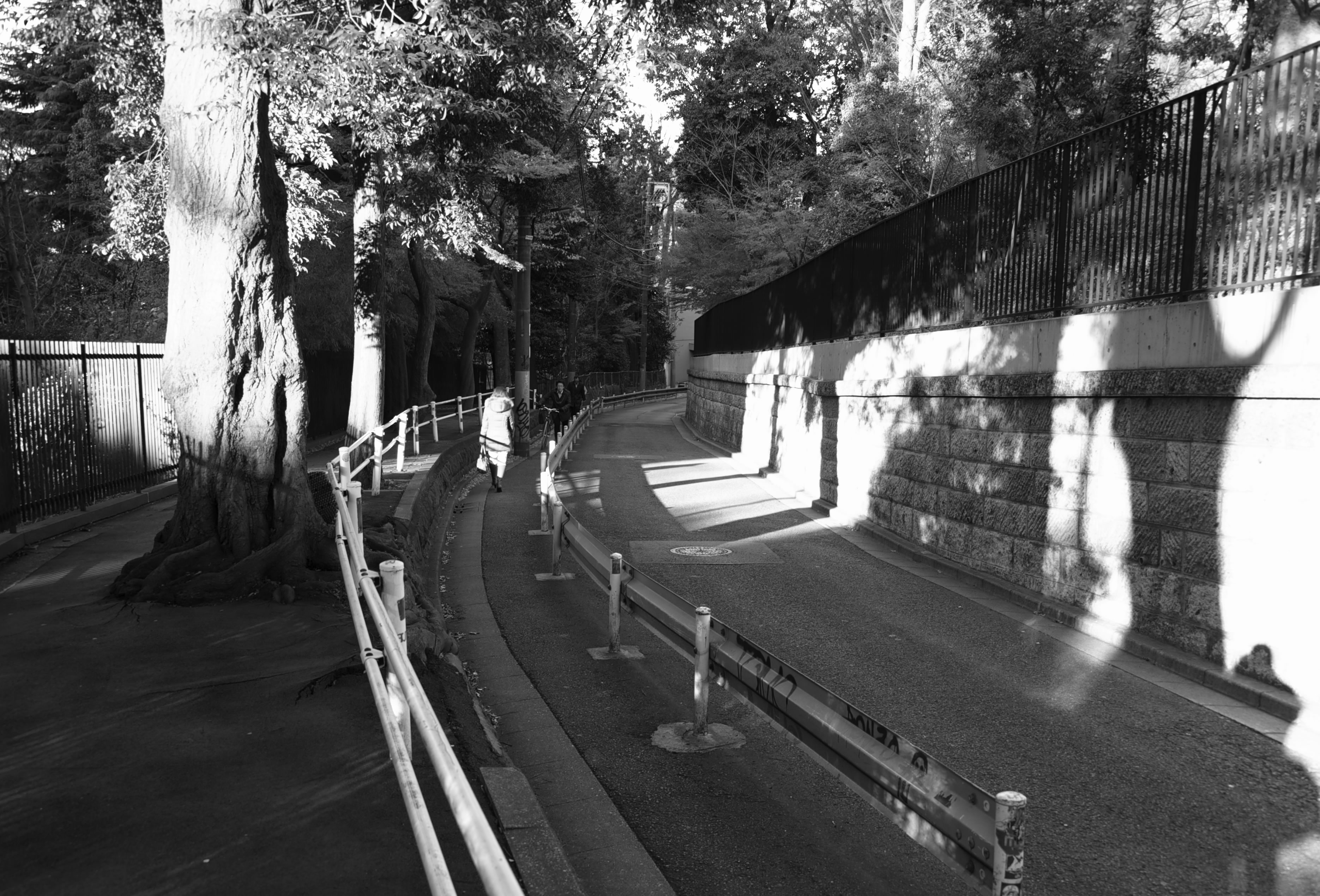 代官山方面から下る坂の右側にある石垣の中には、旧朝倉家の屋敷があります。道を挟んで反対側には、高層マンションの敷地の中に目黒元富士跡があります。江戸時代に富士山信仰が盛んで、この地に富士塚が築かれ浅間神社が祀られていた処です。この坂の見所はゆったりとしたカーブと静かな環境が今も残っているところです。(ストリートビュー)